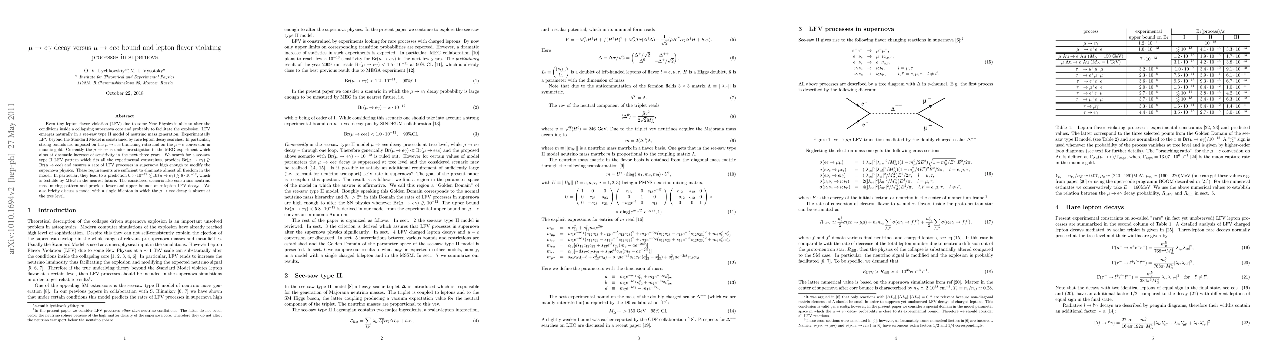 Even tiny lepton flavor violation (LFV) due to some New Physics is able to alter the conditions inside a collapsing supernova core and probably to facilitate the explosion. LFV emerges naturally in a See-Saw type II model of neutrino mass generation. Experimentally LFV is constrained by rare lepton decay searches. In particular, strong bounds are imposed on the mu->eee branching ratio and on the mu-e conversion probability in muonic gold. Currently the mu->e gamma decay is under investigation in the MEG experiment which aims at dramatic increase of sensitivity in the next three years. We search for a See-Saw type II LFV pattern which fits all the experimental constraints, provides Br(mu->e gamma) not less than Br(mu->eee) and ensures a rate of LFV processes in supernova high enough to modify the supernova physics. These requirements are sufficient to eliminate almost all freedom in the model. In particular, they lead to a prediction 0.5*10^(-12) < Br(mu->e gamma)< 6*10^(-12), which is testable by MEG in the nearest future. The considered scenario also constrains neutrino mass-mixing pattern and provides lower and upper bounds on tau-lepton LFV decays. We also briefly discuss a model with a single bilepton in which the mu->eee decay is absent at the tree level.