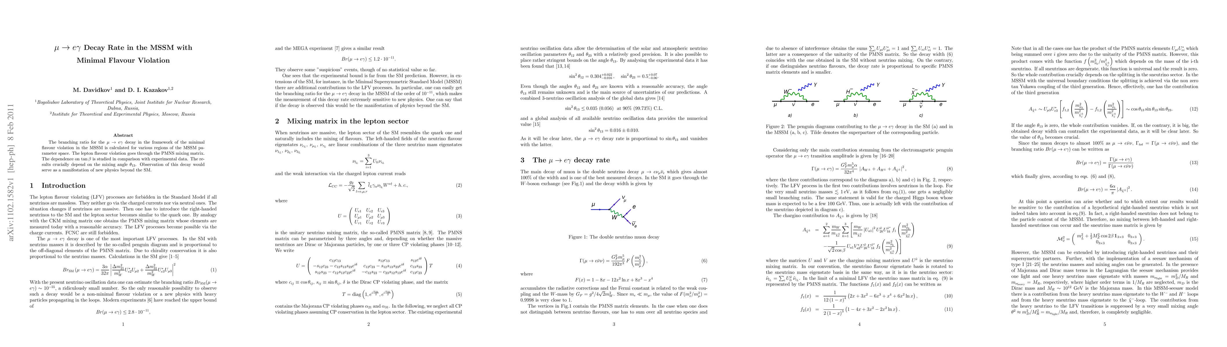 This paper calculates the branching ratio for the mu-->e+gamma decay within the MSSM framework under minimal flavour violation, analyzing the dependence on tanbeta and the mixing angle theta_{13}. The findings suggest that observing this decay could indicate new physics beyond the Standard Model.
