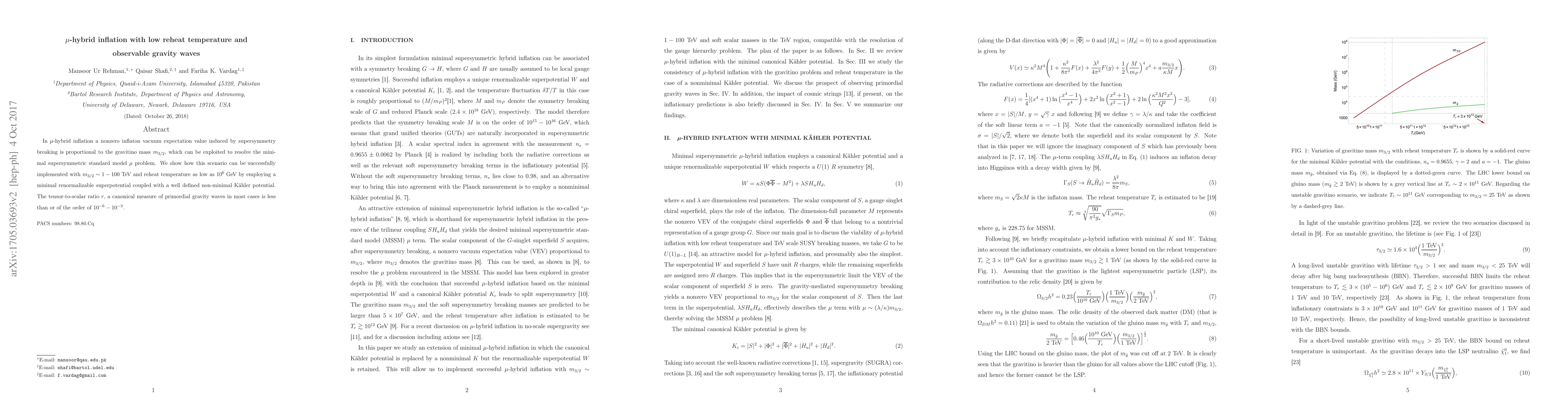 This paper explores $\mu$-hybrid inflation in the context of supersymmetry, demonstrating a viable model with a low reheat temperature of $10^6$ GeV and a gravitino mass $m_{3/2}$ in the range of 1-100 TeV. It predicts a small tensor-to-scalar ratio $r$ of $10^{-6}-10^{-3}$, indicating observable primordial gravity waves.