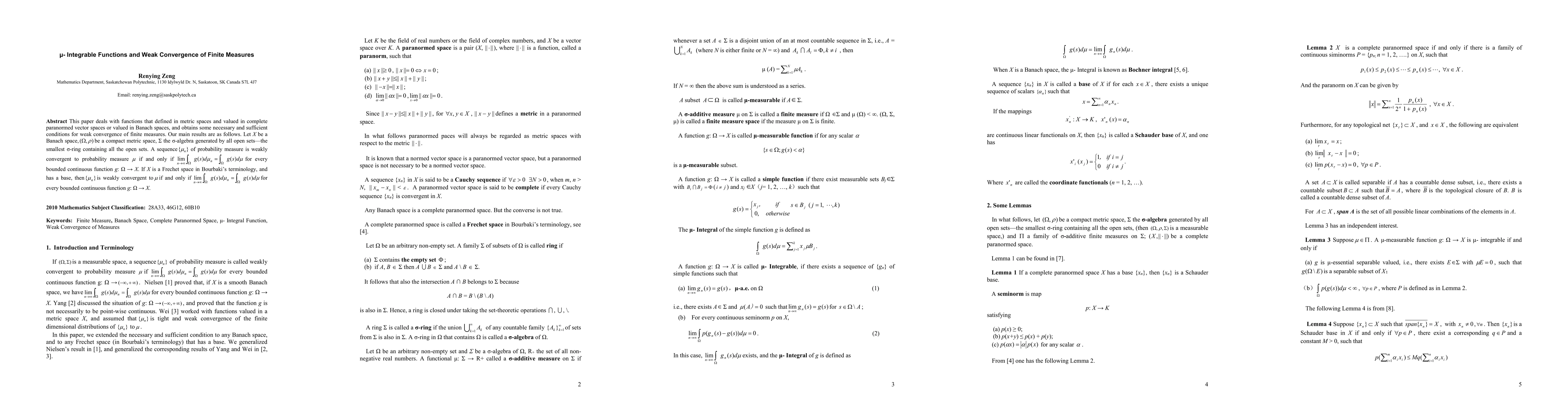 This paper investigates functions in metric spaces with values in complete paranormed vector spaces or Banach spaces, and establishes necessary and sufficient conditions for the weak convergence of finite measures.