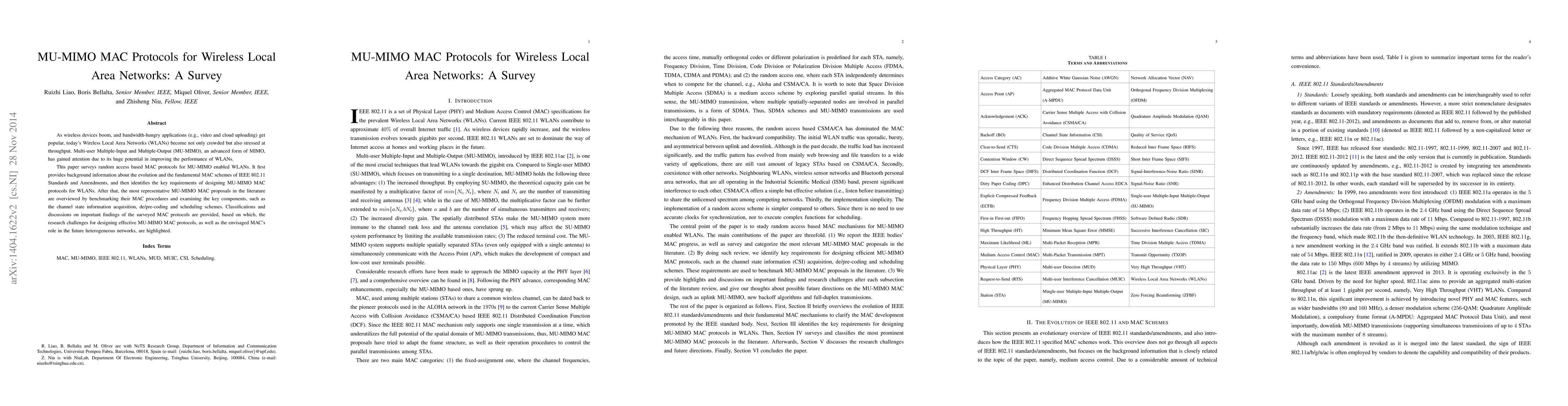 This paper surveys random access-based MAC protocols for MU-MIMO WLANs, reviewing key requirements and representative proposals, and discusses challenges and future directions for effective MU-MIMO MAC design in heterogeneous networks.