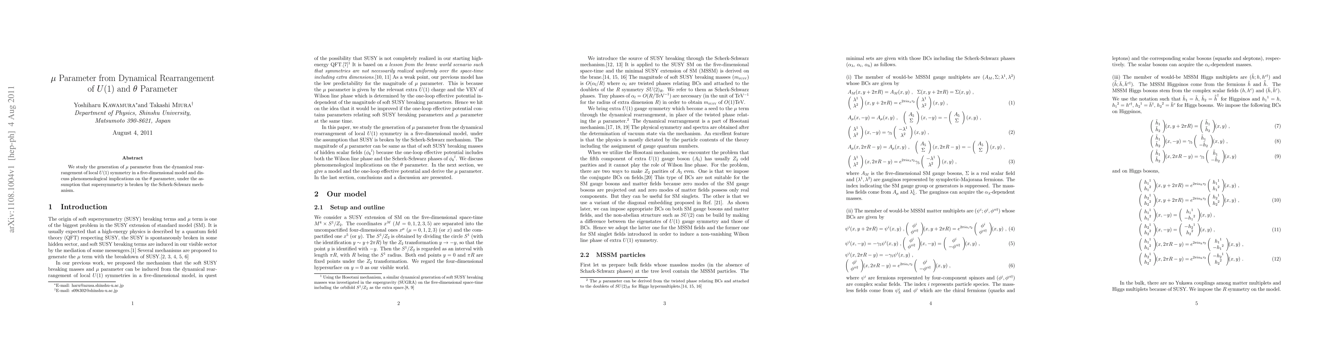 This research explores the origin of the $mu$ parameter through the dynamic reorganization of local U(1) symmetry in a five-dimensional model, discussing implications for the $ heta$ parameter, assuming supersymmetry breakage via the Scherk-Schwarz mechanism.