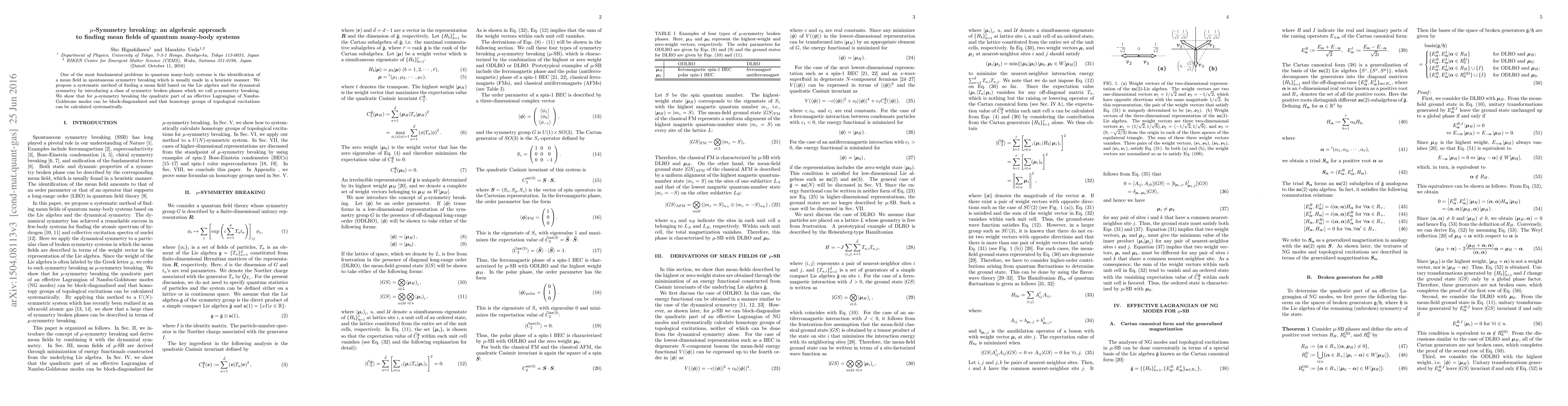 This paper proposes a systematic algebraic method for identifying mean fields in quantum many-body systems experiencing spontaneous symmetry breaking, leveraging Lie algebra and dynamical symmetry to introduce $\mu$-symmetry breaking phases. This approach allows for the block-diagonalization of the quadratic part of an effective Lagrangian and systematic calculation of homotopy groups of topological excitations.