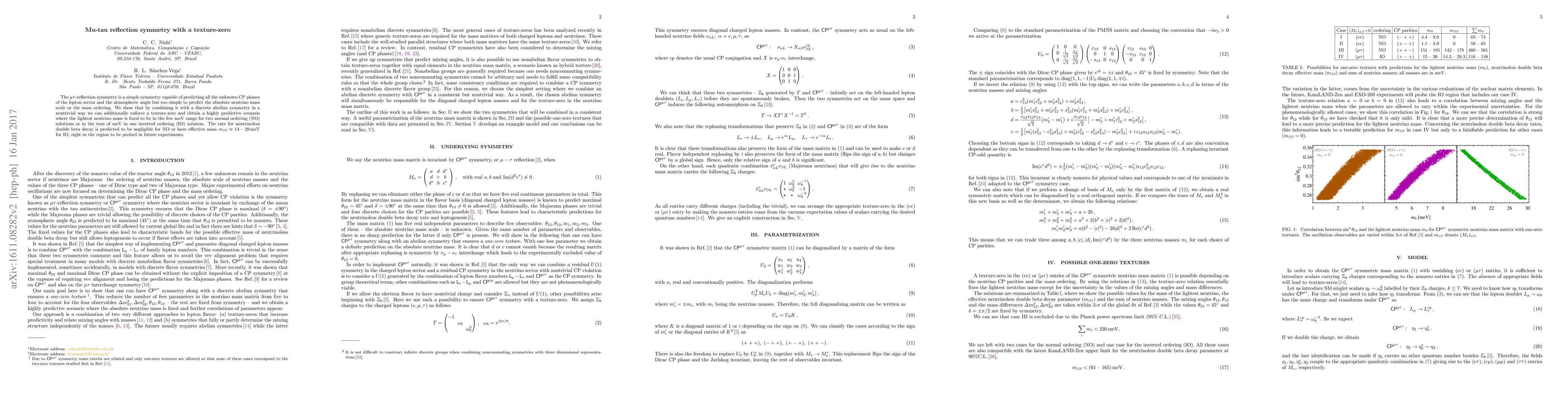 The $\mu\tau$-reflection symmetry is a simple symmetry capable of predicting all the unknown CP phases of the lepton sector and the atmospheric angle but too simple to predict the absolute neutrino mass scale or the mass ordering. We show that by combining it with a discrete abelian symmetry in a nontrivial way we can additionally enforce a texture-zero and obtain a highly predictive scenario where the lightest neutrino mass is fixed to be in the few meV range for two normal ordering (NO) solutions or in the tens of meV in one inverted ordering (IO) solution. The rate for neutrinoless double beta decay is predicted to be negligible for NO or have effective mass $m_{\beta\beta}\approx 14\text{ -- }29\,{\rm meV}$ for IO, right in the region to be probed in future experiments.
