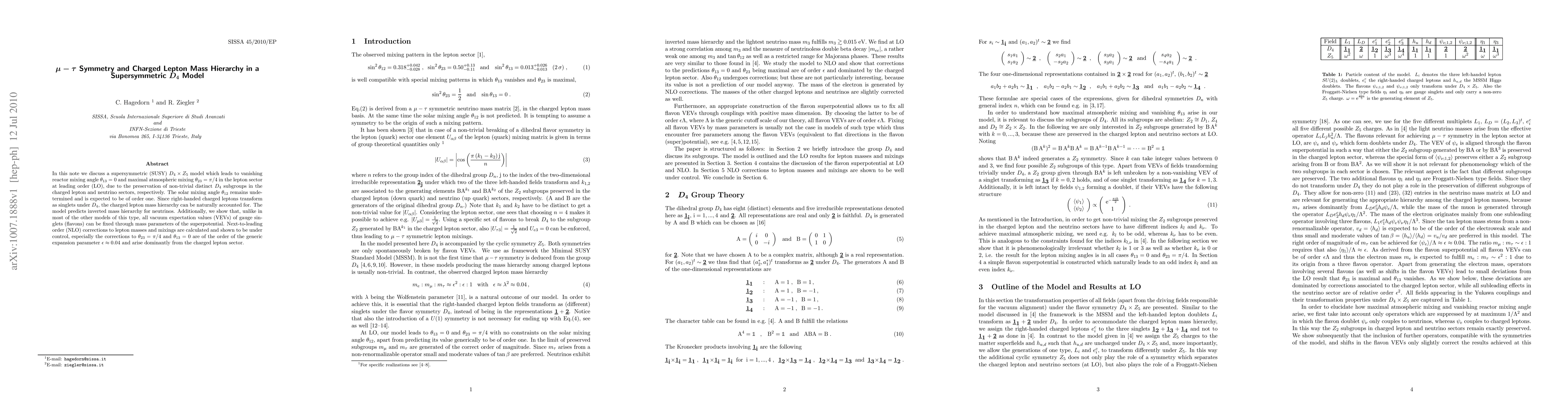 In this note we discuss a supersymmetric (SUSY) D4 x Z5 model which leads to vanishing reactor mixing angle theta_13=0 and maximal atmospheric mixing theta_23=pi/4 in the lepton sector at leading order (LO), due to the preservation of non-trivial distinct D4 subgroups in the charged lepton and neutrino sectors, respectively. The solar mixing angle theta_12 remains undetermined and is expected to be of order one. Since right-handed charged leptons transform as singlets under D4, the charged lepton mass hierarchy can be naturally accounted for. The model predicts inverted mass hierarchy for neutrinos. Additionally, we show that, unlike in most of the other models of this type, all vacuum expectation values (VEVs) of gauge singlets (flavons) can be fixed through mass parameters of the superpotential. Next-to-leading order (NLO) corrections to lepton masses and mixings are calculated and shown to be under control, especially the corrections to theta_23=pi/4 and theta_13=0 are of the order of the generic expansion parameter epsilon = 0.04 and arise dominantly from the charged lepton sector.