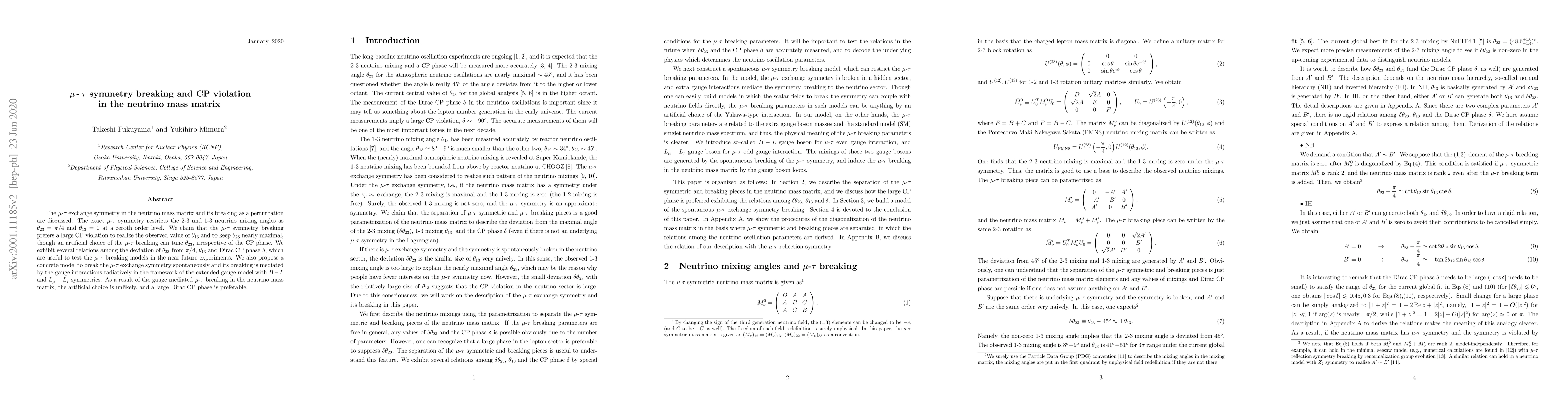 This paper discusses the $\mu$-$\tau$ symmetry in the neutrino mass matrix and its breaking, showing that symmetry breaking favors large CP violation to achieve observed mixing angles. It proposes a model where $\mu$-$\tau$ symmetry is spontaneously broken and mediated by gauge interactions, suggesting a large Dirac CP phase is preferable.