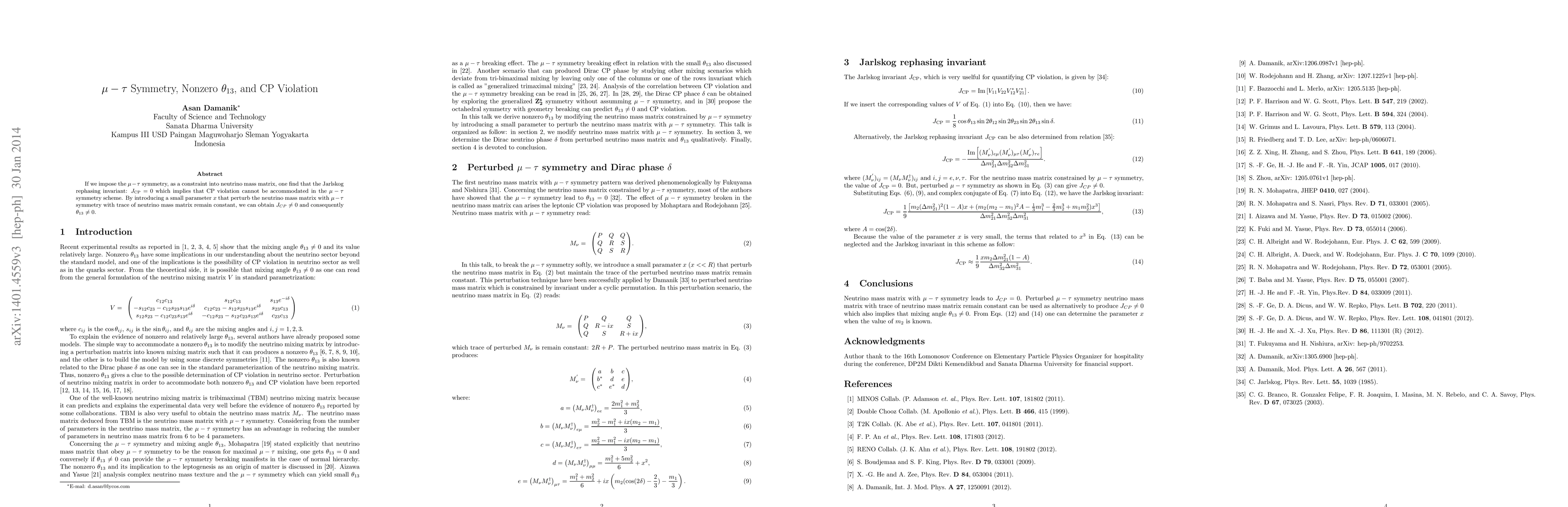 The study finds that imposing $\mu-\tau$ symmetry on the neutrino mass matrix leads to $J_{\rm CP}=0$, ruling out CP violation. However, by introducing a small perturbation with parameter $x$, it allows for $J_{\rm CP}\neq 0$ and consequently nonzero $\theta_{13}$.