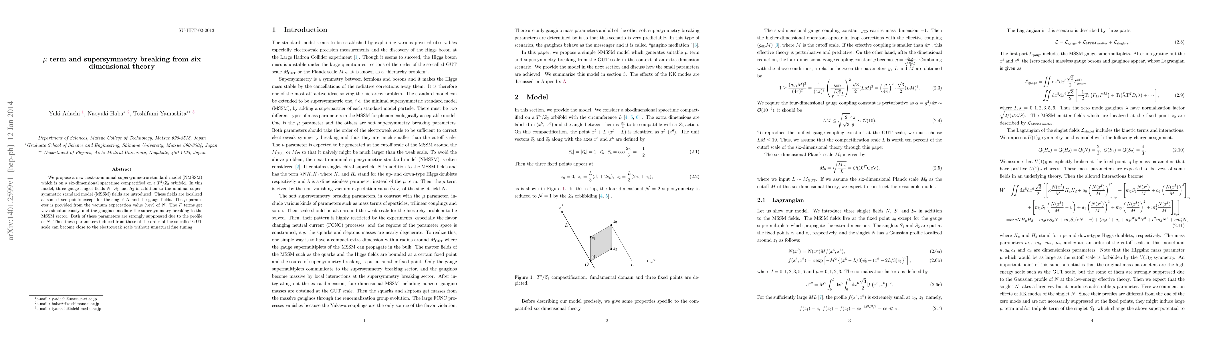This research proposes a new model, a six-dimensional next-to-minimal supersymmetric standard model (NMSSM) on a $T^2/Z_3$ orbifold, introducing three gauge singlet fields to provide the $mu$ parameter and mediate supersymmetry breaking. These fields' localization suppresses $mu$ and supersymmetry breaking terms, allowing values near the electroweak scale without fine-tuning.