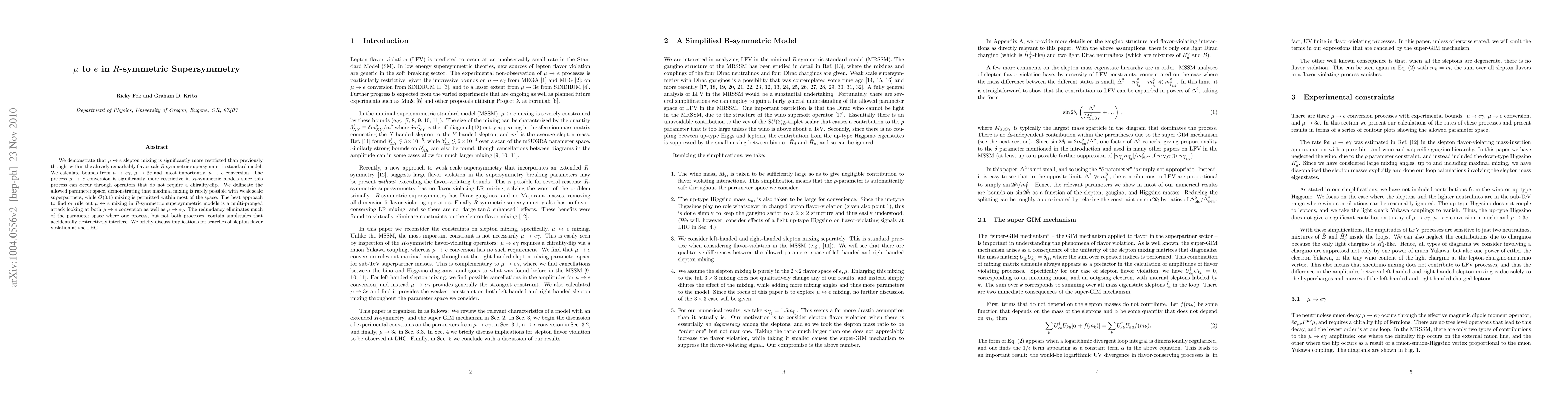 We demonstrate that mu/e slepton mixing is significantly more restricted than previously thought within the already remarkably flavor-safe R-symmetric supersymmetric standard model. We calculate bounds from mu to e gamma, mu to 3e and, most importantly, mu to e conversion. The process mu to e conversion is significantly more restrictive in R-symmetric models since this process can occur through operators that do not require a chirality-flip. We delineate the allowed parameter space, demonstrating that maximal mixing is rarely possible with weak scale superpartners, while O(0.1) mixing is permitted within most of the space. The best approach to find or rule out mu/e mixing in R-symmetric supersymmetric models is a multi-pronged attack looking at both mu to e conversion as well as mu to e gamma. The redundancy eliminates much of the parameter space where one process, but not both processes, contain amplitudes that accidentally destructively interfere. We briefly discuss implications for searches of slepton flavor violation at the LHC.