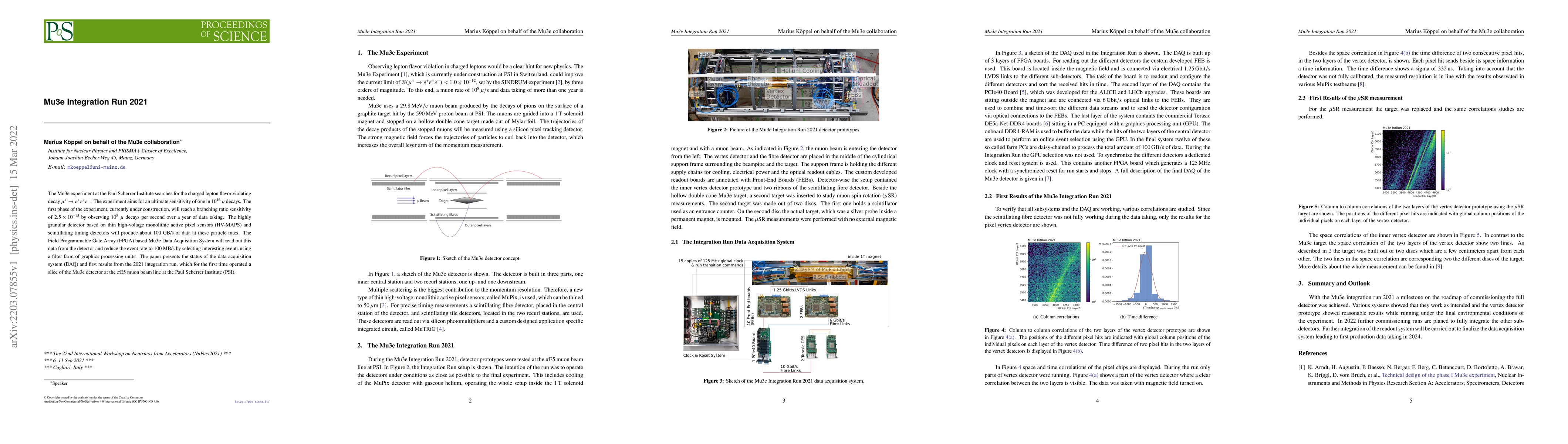 The Mu3e experiment aims to detect the rare decay $\mu^+ \rightarrow e^+ e^+ e^-$ with unprecedented sensitivity. The 2021 integration run tested a slice of the detector at PSI, achieving initial results and demonstrating the data acquisition system's capability to handle high data rates.