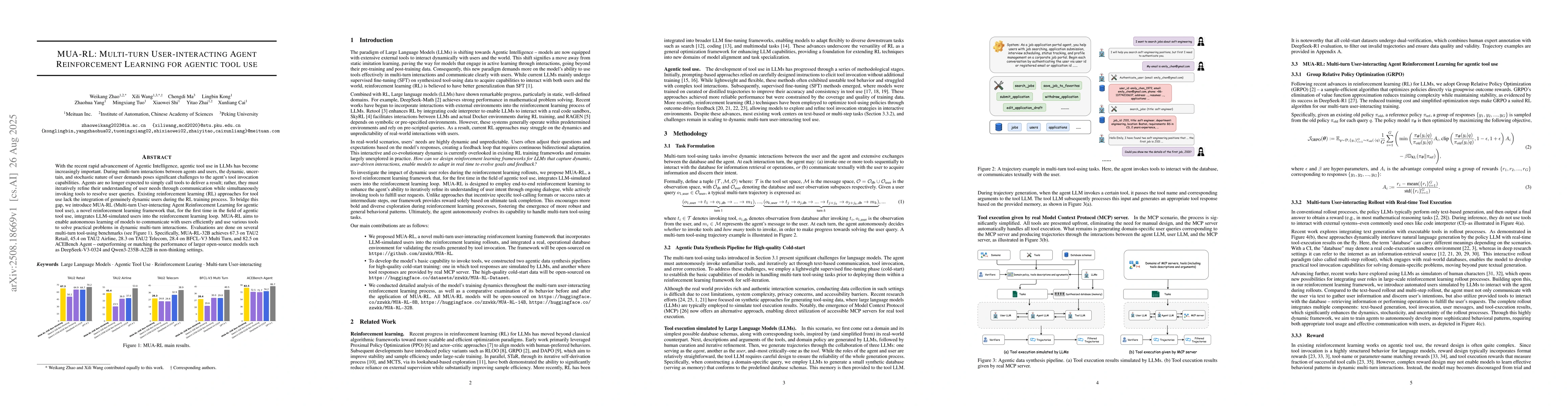 With the recent rapid advancement of Agentic Intelligence, agentic tool use in LLMs has become increasingly important. During multi-turn interactions between agents and users, the dynamic, uncertain, and stochastic nature of user demands poses significant challenges to the agent's tool invocation capabilities. Agents are no longer expected to simply call tools to deliver a result; rather, they must iteratively refine their understanding of user needs through communication while simultaneously invoking tools to resolve user queries. Existing reinforcement learning (RL) approaches for tool use lack the integration of genuinely dynamic users during the RL training process. To bridge this gap, we introduce MUA-RL (Multi-turn User-interacting Agent Reinforcement Learning for agentic tool use), a novel reinforcement learning framework that, for the first time in the field of agentic tool use, integrates LLM-simulated users into the reinforcement learning loop. MUA-RL aims to enable autonomous learning of models to communicate with users efficiently and use various tools to solve practical problems in dynamic multi-turn interactions. Evaluations are done on several multi-turn tool-using benchmarks (see Figure 1). Specifically, MUA-RL-32B achieves 67.3 on TAU2 Retail, 45.4 on TAU2 Airline, 28.3 on TAU2 Telecom, 28.4 on BFCL-V3 Multi Turn, and 82.5 on ACEBench Agent -- outperforming or matching the performance of larger open-source models such as DeepSeek-V3-0324 and Qwen3-235B-A22B in non-thinking settings.