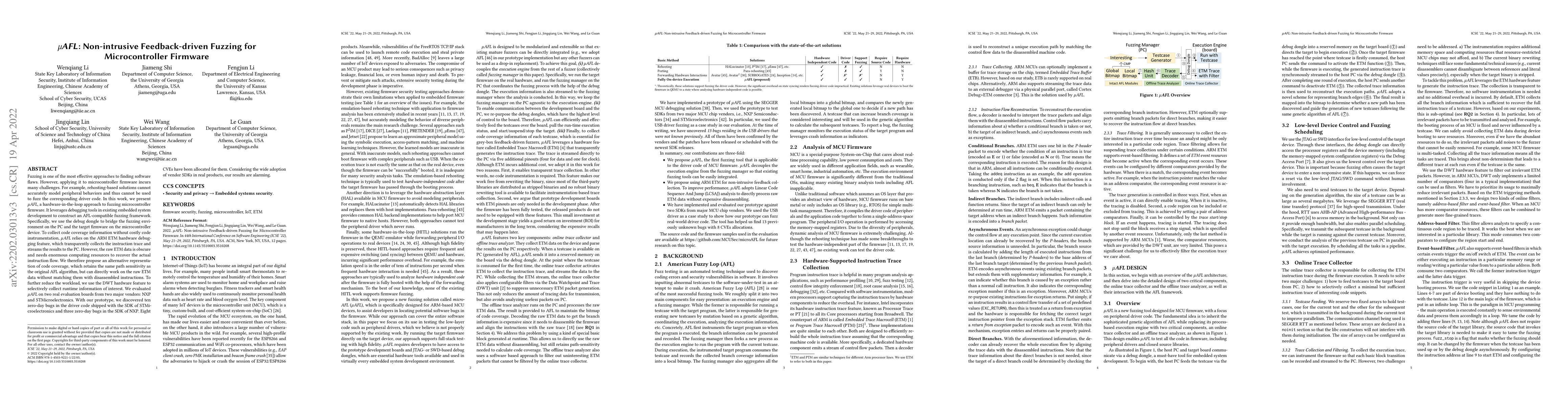 Researchers developed $μAFL$, a non-intrusive fuzzing approach for microcontroller firmware that uses debugging tools to model peripheral behaviors without code instrumentation.