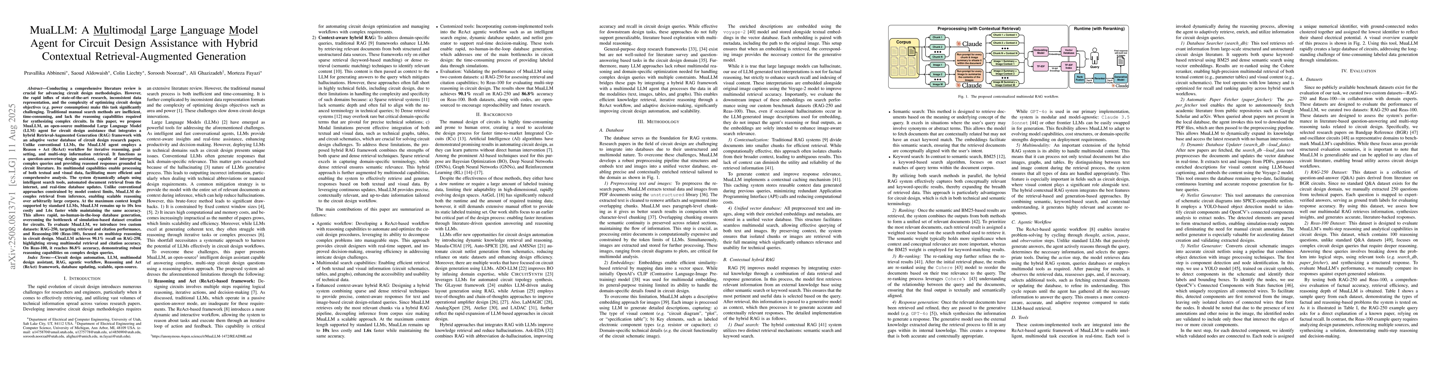 The paper introduces MuaLLM, a multimodal large language model agent for circuit design assistance, integrating a hybrid Retrieval-Augmented Generation (RAG) framework with an adaptive vector database of circuit design research papers. MuaLLM employs a Reason + Act (ReAct) workflow for iterative reasoning, goal-setting, and multi-step information retrieval, capable of processing both textual and visual data.