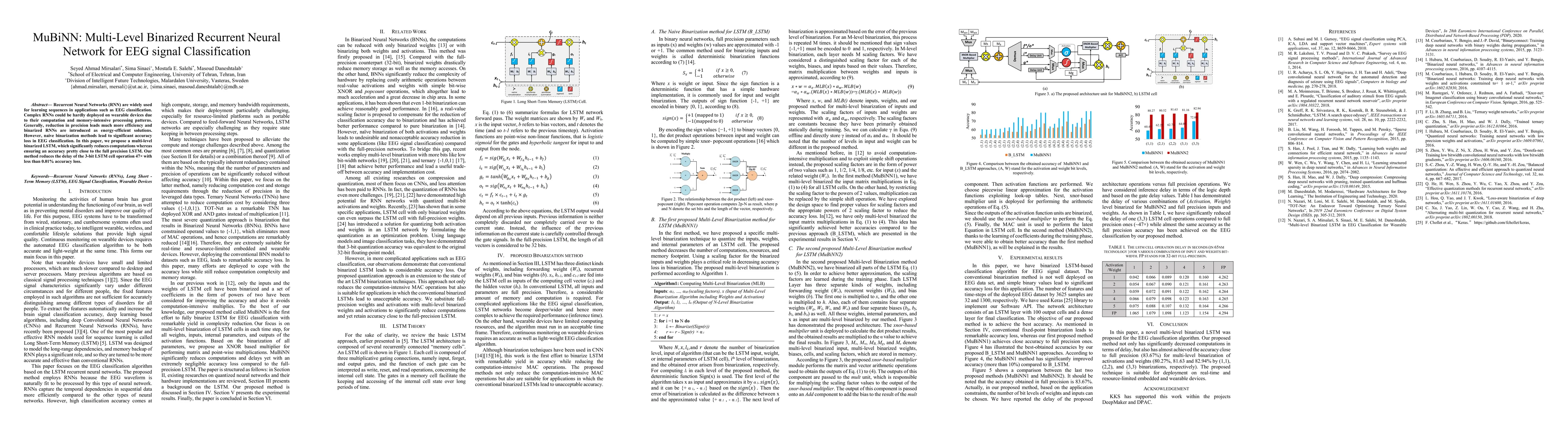 Title: MuBiNN: Multi-Level Binarized Recurrent Neural Network for EEG signal Classification Summary: This paper proposes a multi-level binarized LSTM to efficiently classify EEG signals while minimizing computation and memory usage, achieving nearly full precision LSTM accuracy with a significant reduction in processing delay.