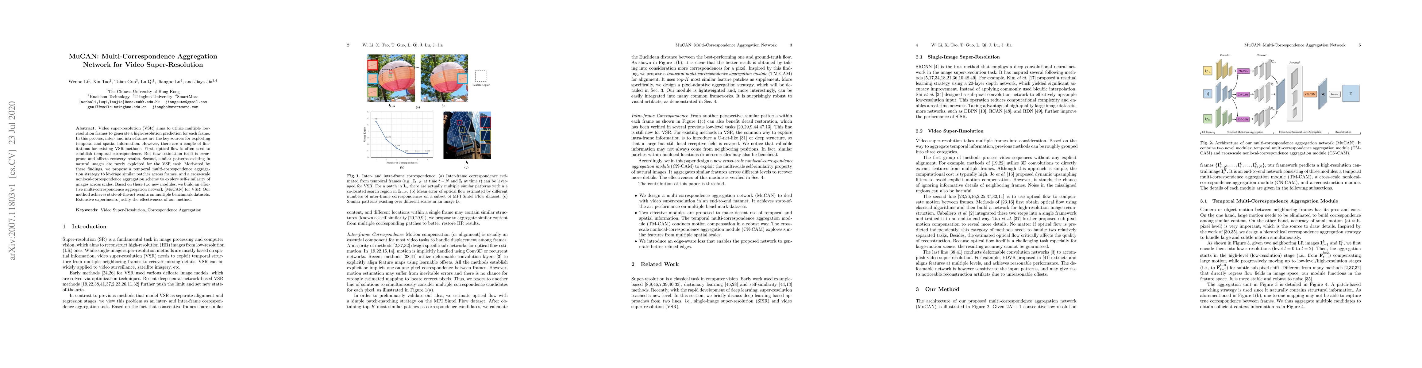 MuCAN introduces a temporal multi-correspondence aggregation strategy and a cross-scale nonlocal-correspondence aggregation scheme to enhance video super-resolution by leveraging similar patches across frames and self-similarity across scales, achieving state-of-the-art results.