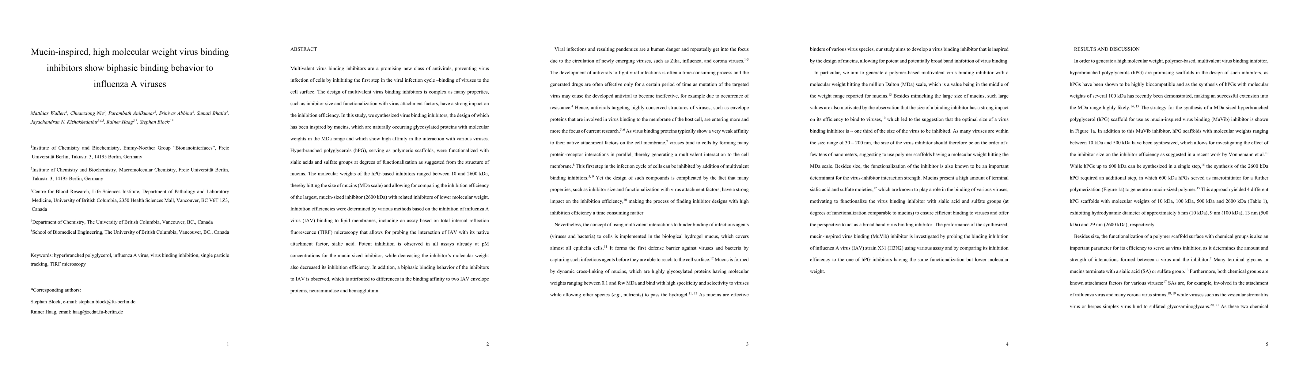 This study synthesizes mucin-inspired, high molecular weight virus binding inhibitors that exhibit biphasic binding behavior to influenza A viruses. The inhibitors, functionalized hyperbranched polyglycerols, show potent inhibition at pM concentrations, especially for the largest inhibitors, and their efficiency decreases with lower molecular weights.