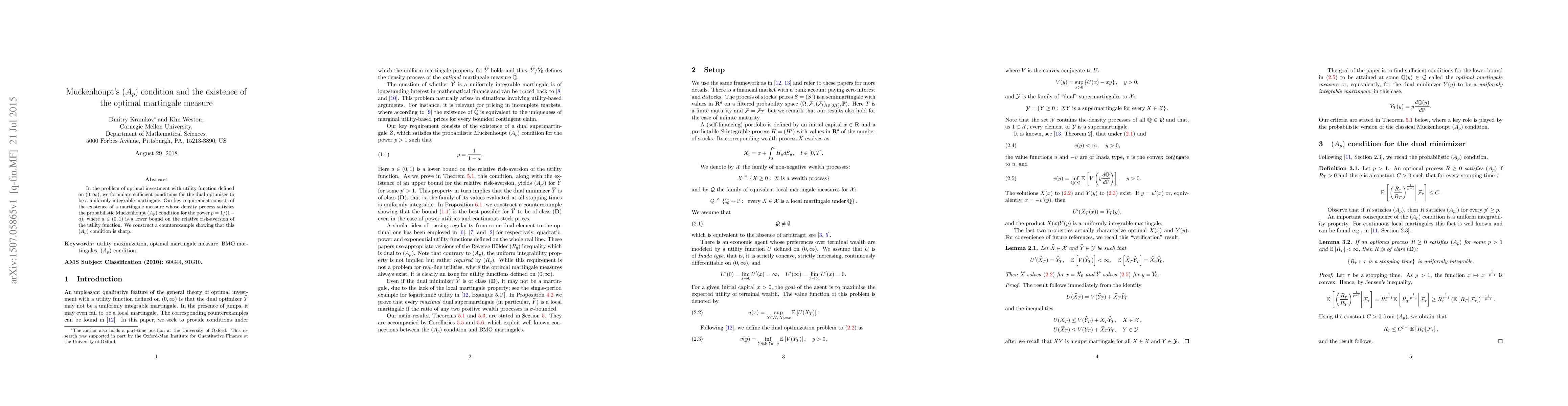 This paper establishes sufficient conditions for the existence of an optimal martingale measure in optimal investment problems, requiring the martingale measure's density to satisfy the probabilistic Muckenhoupt $(A_p)$ condition for $p=1/(1-a)$. It also provides a counterexample demonstrating the sharpness of this condition.