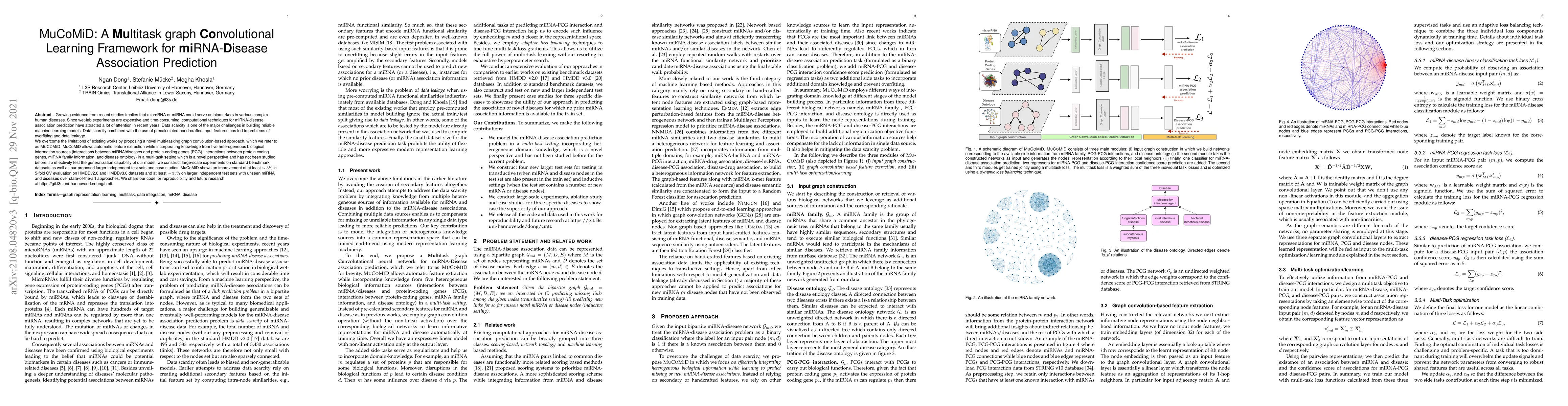 MuCoMiD is a novel multi-tasking graph convolution-based framework for predicting miRNA-disease associations, addressing data scarcity and overfitting issues. It leverages heterogeneous biological data sources to automatically extract features, showing improved performance over existing methods.