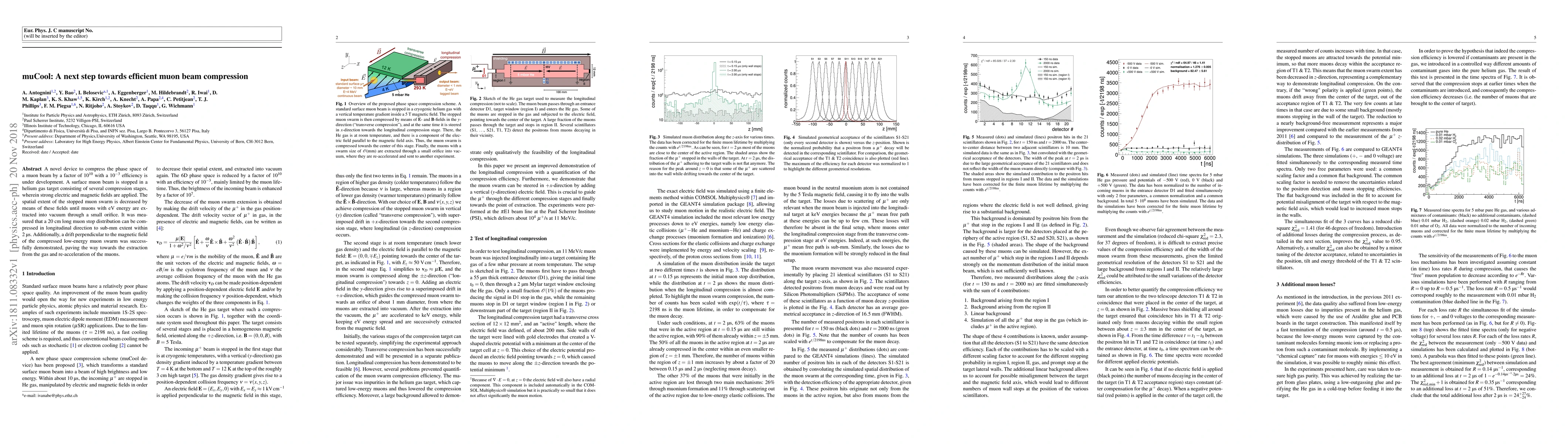 A novel device to compress the phase space of a muon beam by a factor of $10^{10}$ with a $10^{-3}$ efficiency is under development. A surface muon beam is stopped in a helium gas target consisting of several compression stages, wherein strong electric and magnetic fields are applied. The spatial extent of the stopped muon swarm is decreased by means of these fields until muons with eV energy are extracted into vacuum through a small orifice. It was measured that a 20 cm long muon stop distribution can be compressed in longitudinal direction to sub-mm extent within 2 ${\rm \mu s}$. Additionally, a drift perpendicular to the magnetic field of the compressed low-energy muon swarm was successfully demonstrated, paving the way towards the extraction from the gas and re-acceleration of the muons.