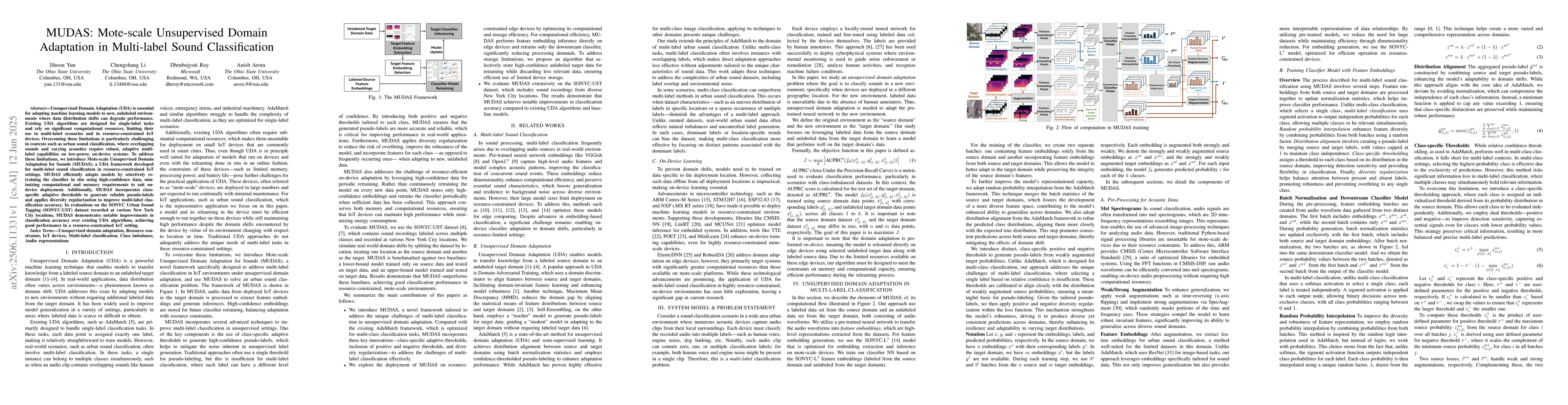 Unsupervised Domain Adaptation (UDA) is essential for adapting machine learning models to new, unlabeled environments where data distribution shifts can degrade performance. Existing UDA algorithms are designed for single-label tasks and rely on significant computational resources, limiting their use in multi-label scenarios and in resource-constrained IoT devices. Overcoming these limitations is particularly challenging in contexts such as urban sound classification, where overlapping sounds and varying acoustics require robust, adaptive multi-label capabilities on low-power, on-device systems. To address these limitations, we introduce Mote-scale Unsupervised Domain Adaptation for Sounds (MUDAS), a UDA framework developed for multi-label sound classification in resource-constrained IoT settings. MUDAS efficiently adapts models by selectively retraining the classifier in situ using high-confidence data, minimizing computational and memory requirements to suit on-device deployment. Additionally, MUDAS incorporates class-specific adaptive thresholds to generate reliable pseudo-labels and applies diversity regularization to improve multi-label classification accuracy. In evaluations on the SONYC Urban Sound Tagging (SONYC-UST) dataset recorded at various New York City locations, MUDAS demonstrates notable improvements in classification accuracy over existing UDA algorithms, achieving good performance in a resource-constrained IoT setting.