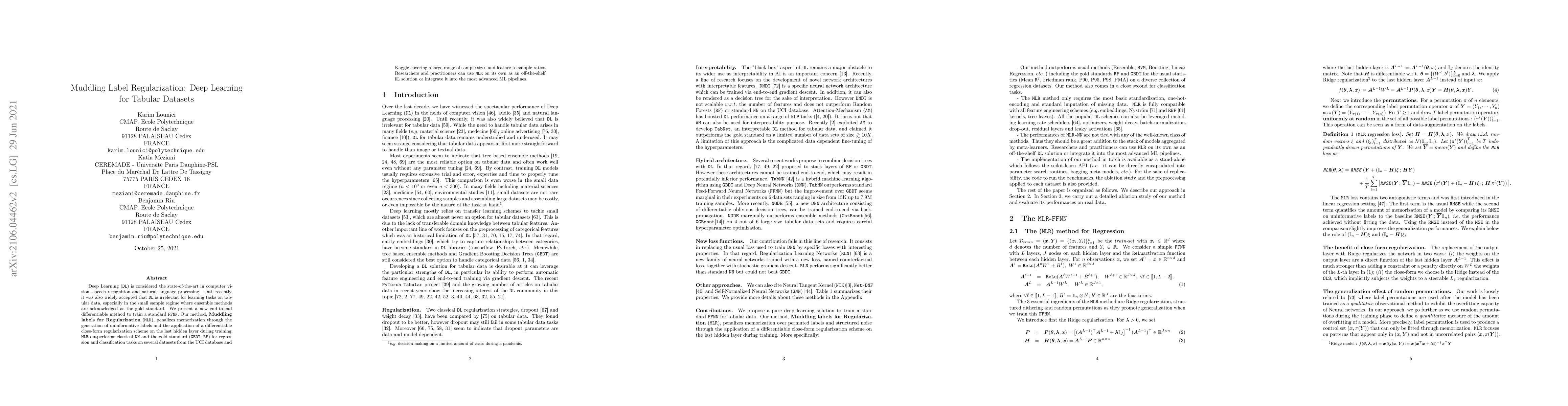 Deep Learning (DL) is considered the state-of-the-art in computer vision, speech recognition and natural language processing. Until recently, it was also widely accepted that DL is irrelevant for learning tasks on tabular data, especially in the small sample regime where ensemble methods are acknowledged as the gold standard. We present a new end-to-end differentiable method to train a standard FFNN. Our method, \textbf{Muddling labels for Regularization} (\texttt{MLR}), penalizes memorization through the generation of uninformative labels and the application of a differentiable close-form regularization scheme on the last hidden layer during training. \texttt{MLR} outperforms classical NN and the gold standard (GBDT, RF) for regression and classification tasks on several datasets from the UCI database and Kaggle covering a large range of sample sizes and feature to sample ratios. Researchers and practitioners can use \texttt{MLR} on its own as an off-the-shelf \DL{} solution or integrate it into the most advanced ML pipelines.
