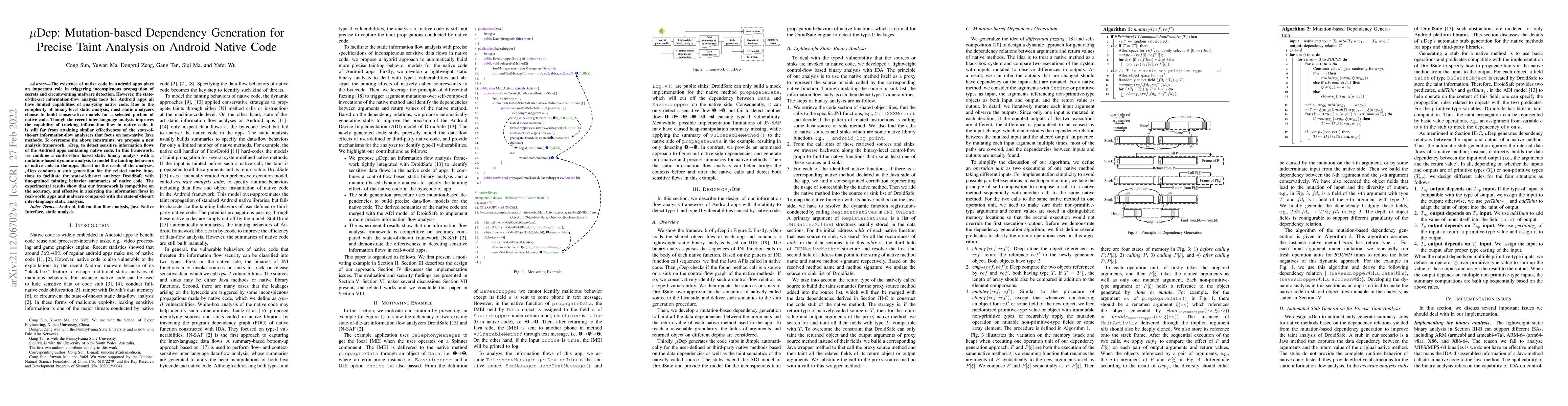 The paper proposes a new framework, $\mu$Dep, to enhance taint analysis for Android native code by combining static binary analysis with mutation-based dynamic analysis, generating fine-grained tainting behavior summaries to improve the effectiveness of DroidSafe. Experimental results show $\mu$Dep's competitive accuracy and effectiveness in analyzing information flows in real-world apps and malware.