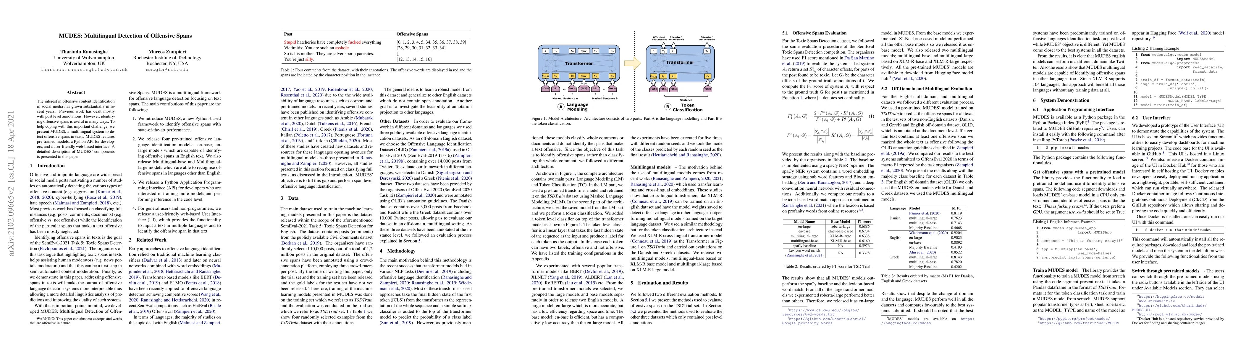 MUDES is a multilingual system designed to detect offensive spans within texts, addressing the growing need for offensive content identification in social media. It includes pre-trained models, a developer-friendly Python API, and a user-friendly web interface.
