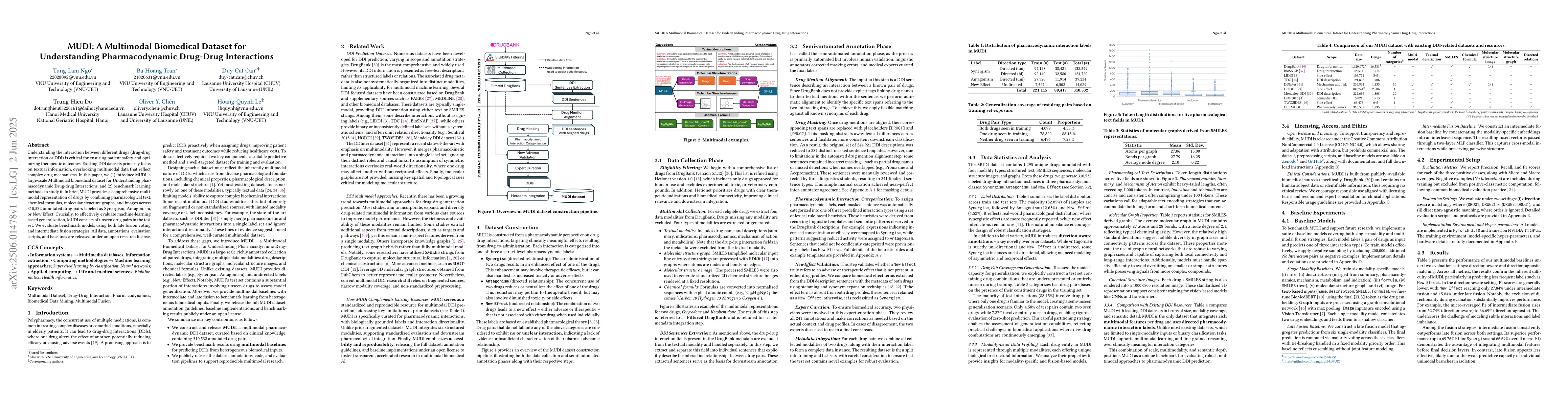 The paper introduces MUDI, a multimodal biomedical dataset for understanding pharmacodynamic drug-drug interactions, combining pharmacological text, chemical formulas, molecular structure graphs, and images across 310,532 annotated drug pairs. Benchmark models are evaluated using late fusion voting and intermediate fusion strategies.