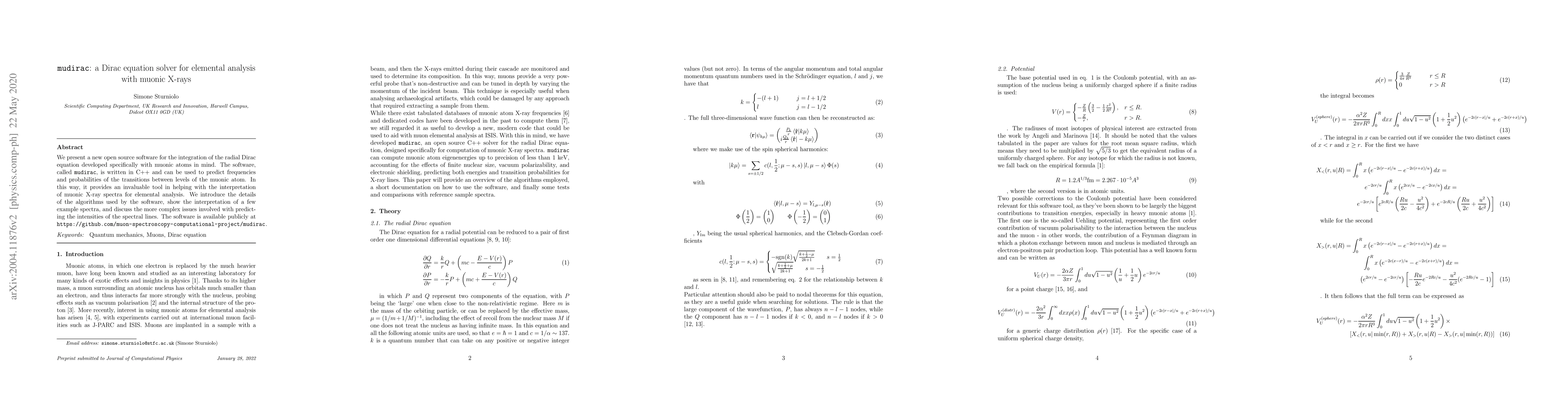 We present a new open source software for the integration of the radial Dirac equation developed specifically with muonic atoms in mind. The software, called mudirac, is written in C++ and can be used to predict frequencies and probabilities of the transitions between levels of the muonic atom. In this way, it provides an invaluable tool in helping with the interpretation of muonic X-ray spectra for elemental analysis. We introduce the details of the algorithms used by the software, show the interpretation of a few example spectra, and discuss the more complex issues involved with predicting the intensities of the spectral lines. The software is available publicly at https://github.com/muon-spectroscopy-computational-project/mudirac.