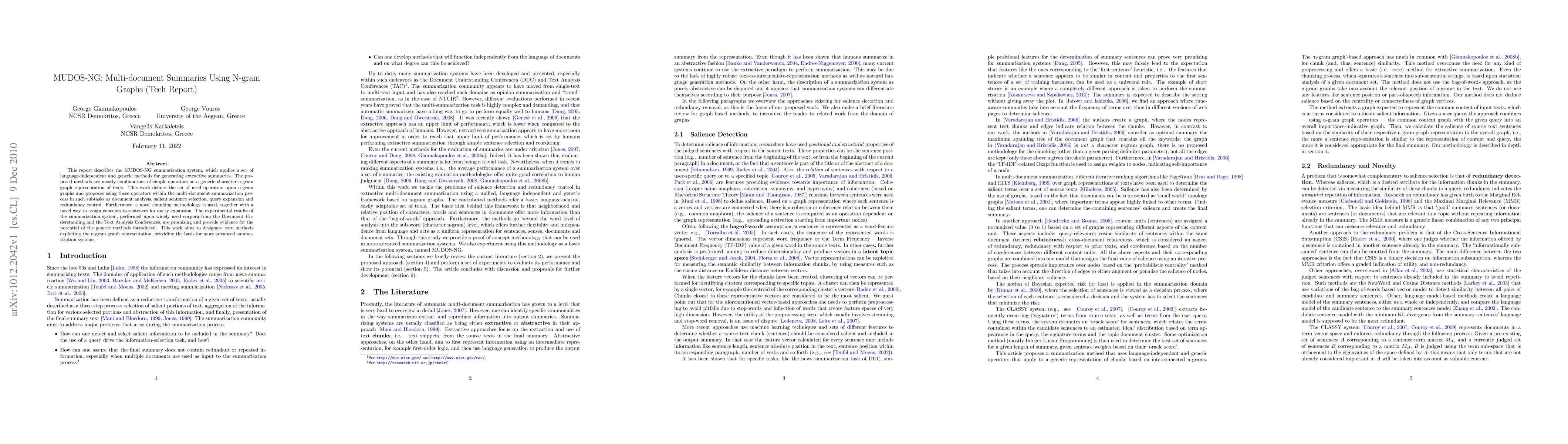 The MUDOS-NG system employs language-independent methods based on n-gram graph representations for generating extractive multi-document summaries, showing promising results on standard corpora. The approach includes novel chunking and concept assignment techniques for enhanced summarization.