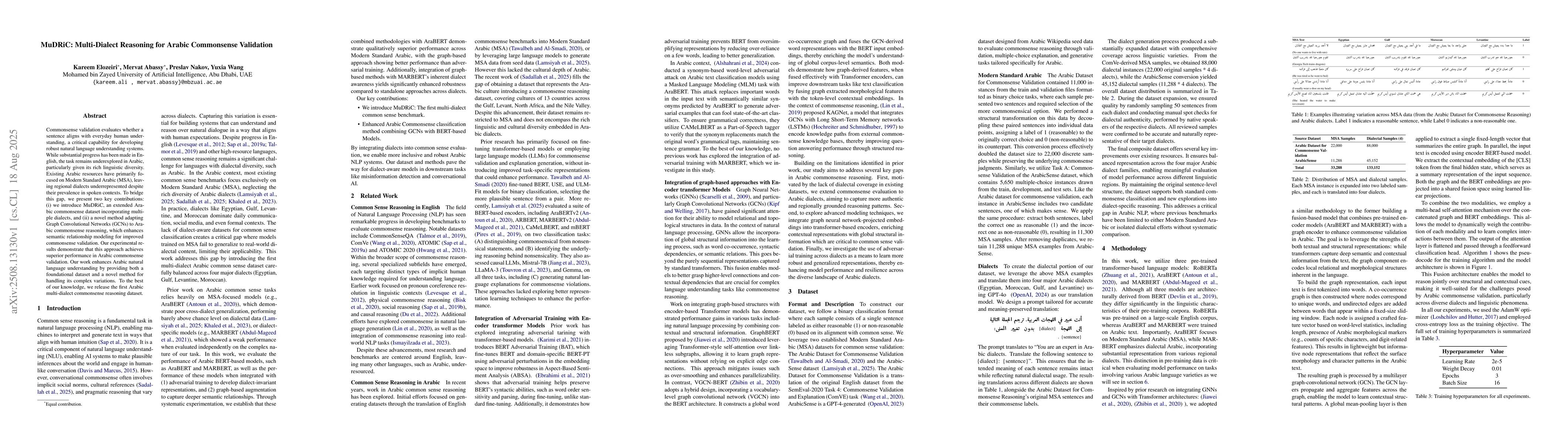 Commonsense validation evaluates whether a sentence aligns with everyday human understanding, a critical capability for developing robust natural language understanding systems. While substantial progress has been made in English, the task remains underexplored in Arabic, particularly given its rich linguistic diversity. Existing Arabic resources have primarily focused on Modern Standard Arabic (MSA), leaving regional dialects underrepresented despite their prevalence in spoken contexts. To bridge this gap, we present two key contributions: (i) we introduce MuDRiC, an extended Arabic commonsense dataset incorporating multiple dialects, and (ii) a novel method adapting Graph Convolutional Networks (GCNs) to Arabic commonsense reasoning, which enhances semantic relationship modeling for improved commonsense validation. Our experimental results demonstrate that this approach achieves superior performance in Arabic commonsense validation. Our work enhances Arabic natural language understanding by providing both a foundational dataset and a novel method for handling its complex variations. To the best of our knowledge, we release the first Arabic multi-dialect commonsense reasoning dataset.