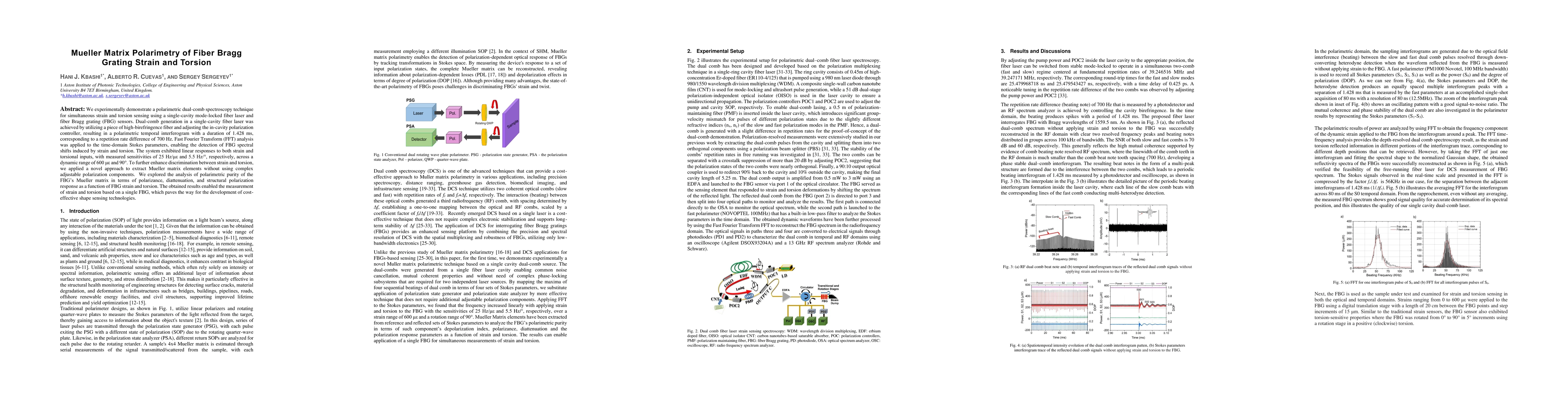 The research presents a novel polarimetric dual-comb spectroscopy technique using a single-cavity mode-locked fiber laser and fiber Bragg grating (FBG) sensors for simultaneous strain and torsion sensing. By analyzing the Mueller matrix elements, the method accurately discriminates between strain and torsion without complex polarization components, enabling cost-effective shape sensing technologies.