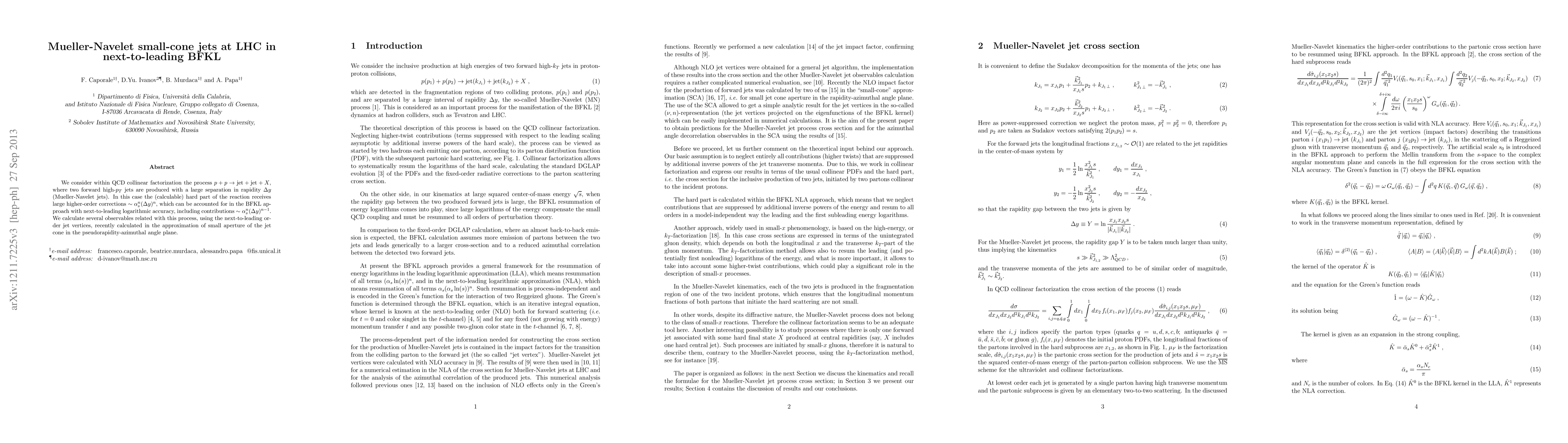This paper investigates the production of Mueller-Navelet jets in high-energy proton-proton collisions at the LHC within QCD collinear factorization, focusing on next-to-leading BFKL logarithmic accuracy. It calculates observables for the process, incorporating higher-order corrections and next-to-leading order jet vertices for small-cone jets.