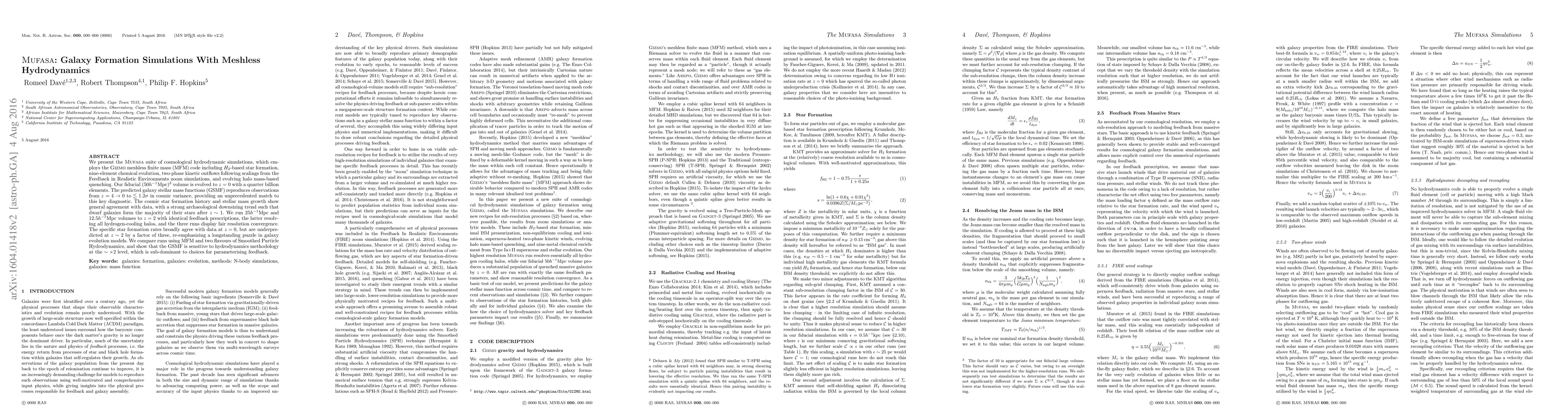 We present the MUFASA suite of cosmological hydrodynamic simulations, which employs the GIZMO meshless finite mass (MFM) code including H2-based star formation, nine-element chemical evolution, two-phase kinetic outflows following scalings from the Feedback in Realistic Environments zoom simulations, and evolving halo mass-based quenching. Our fiducial (50 Mpc/h)^3 volume is evolved to z=0 with a quarter billion particles, The predicted galaxy stellar mass functions (GSMF) reproduce observations from z=4-0 to <1.2sigma in cosmic variance, providing an unprecedented match to this key diagnostic. The cosmic star formation history and stellar mass growth show general agreement with data, with a strong archaeological downsizing trend such that dwarf galaxies form the majority of their stars after z~1. We run 25 Mpc/h and 12.5 Mpc/h volumes to z=2 with identical feedback prescriptions, the latter resolving all hydrogen-cooling halos, and the three runs display fair resolution convergence. The specific star formation rates broadly agree with data at z=0, but are underpredicted at z~2 by a factor of three, re-emphasizing a longstanding puzzle in galaxy evolution models. We compare runs using MFM and two flavours of Smoothed Particle Hydrodynamics, and show that the GSMF is sensitive to hydrodynamics methodology at the ~x2 level, which is sub-dominant to choices for parameterising feedback.