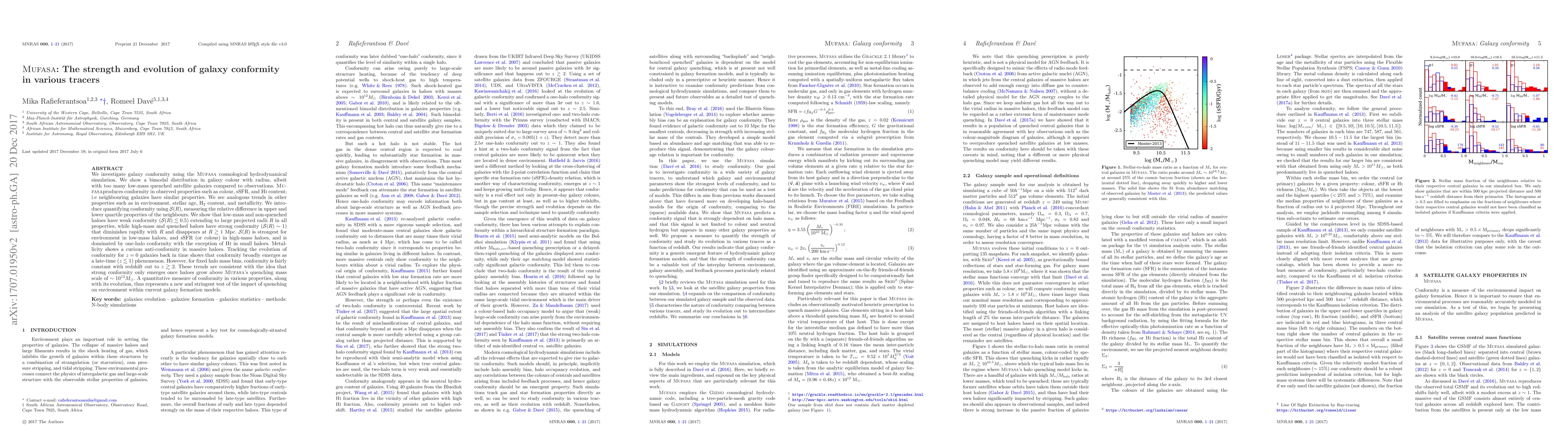 The Mufasa simulation reveals galaxy conformity in various properties, showing strong conformity in high-mass, quenched haloes, while weak conformity in low-mass, non-quenched haloes. Conformity emerges as a late-time phenomenon, consistent with quenching effects in massive haloes.