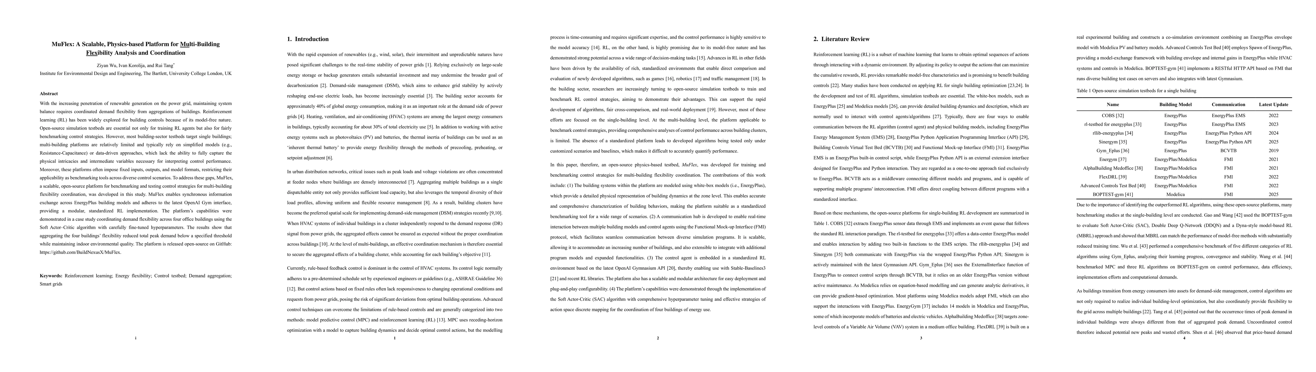With the increasing penetration of renewable generation on the power grid, maintaining system balance requires coordinated demand flexibility from aggregations of buildings. Reinforcement learning (RL) has been widely explored for building controls because of its model-free nature. Open-source simulation testbeds are essential not only for training RL agents but also for fairly benchmarking control strategies. However, most building-sector testbeds target single buildings; multi-building platforms are relatively limited and typically rely on simplified models (e.g., Resistance-Capacitance) or data-driven approaches, which lack the ability to fully capture the physical intricacies and intermediate variables necessary for interpreting control performance. Moreover, these platforms often impose fixed inputs, outputs, and model formats, restricting their applicability as benchmarking tools across diverse control scenarios. To address these gaps, MuFlex, a scalable, open-source platform for benchmarking and testing control strategies for multi-building flexibility coordination, was developed in this study. MuFlex enables synchronous information exchange across EnergyPlus building models and adheres to the latest OpenAI Gym interface, providing a modular, standardized RL implementation. The platform capabilities were demonstrated in a case study coordinating demand flexibility across four office buildings using the Soft Actor-Critic algorithm with carefully fine-tuned hyperparameters. The results show that aggregating the four buildings flexibility reduced total peak demand below a specified threshold while maintaining indoor environmental quality.