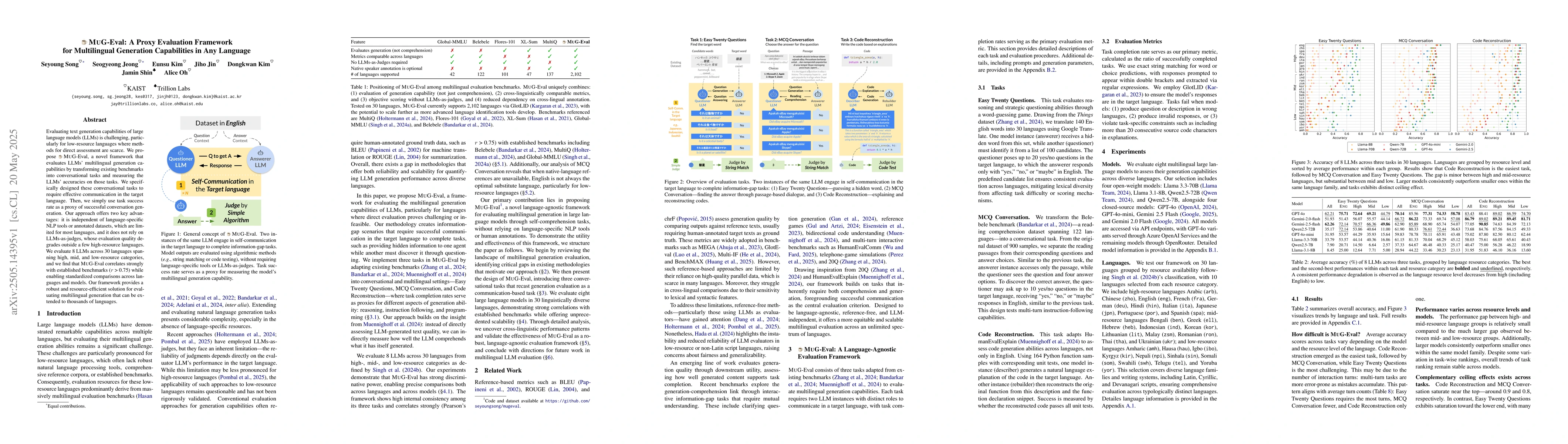 MUG-Eval transforms existing benchmarks into conversational tasks to evaluate LLMs' multilingual generation capabilities, measuring task success rate as a proxy for successful conversation generation. It's independent of language-specific NLP tools or datasets and doesn't rely on LLMs-as-judges.