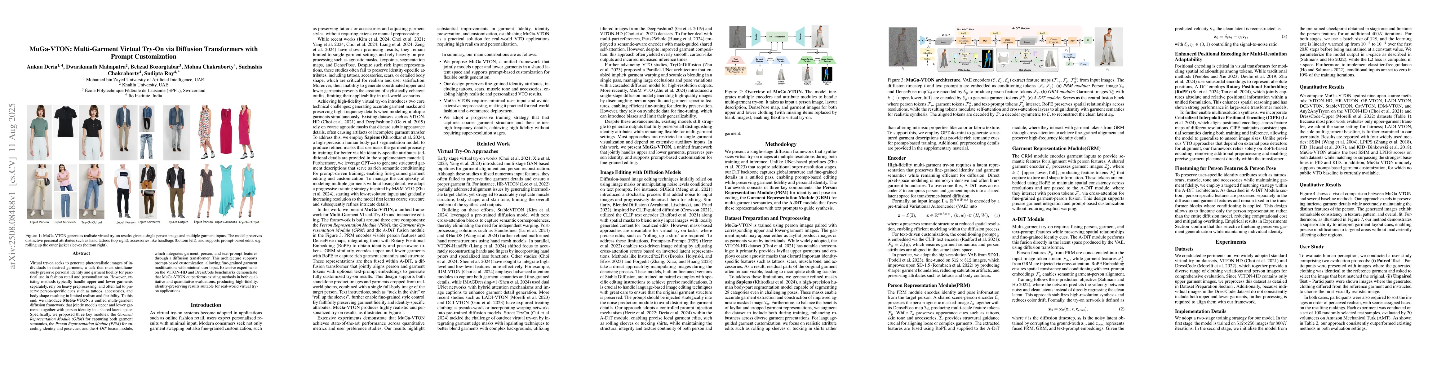Virtual try-on seeks to generate photorealistic images of individuals in desired garments, a task that must simultaneously preserve personal identity and garment fidelity for practical use in fashion retail and personalization. However, existing methods typically handle upper and lower garments separately, rely on heavy preprocessing, and often fail to preserve person-specific cues such as tattoos, accessories, and body shape-resulting in limited realism and flexibility. To this end, we introduce MuGa-VTON, a unified multi-garment diffusion framework that jointly models upper and lower garments together with person identity in a shared latent space. Specifically, we proposed three key modules: the Garment Representation Module (GRM) for capturing both garment semantics, the Person Representation Module (PRM) for encoding identity and pose cues, and the A-DiT fusion module, which integrates garment, person, and text-prompt features through a diffusion transformer. This architecture supports prompt-based customization, allowing fine-grained garment modifications with minimal user input. Extensive experiments on the VITON-HD and DressCode benchmarks demonstrate that MuGa-VTON outperforms existing methods in both qualitative and quantitative evaluations, producing high-fidelity, identity-preserving results suitable for real-world virtual try-on applications.