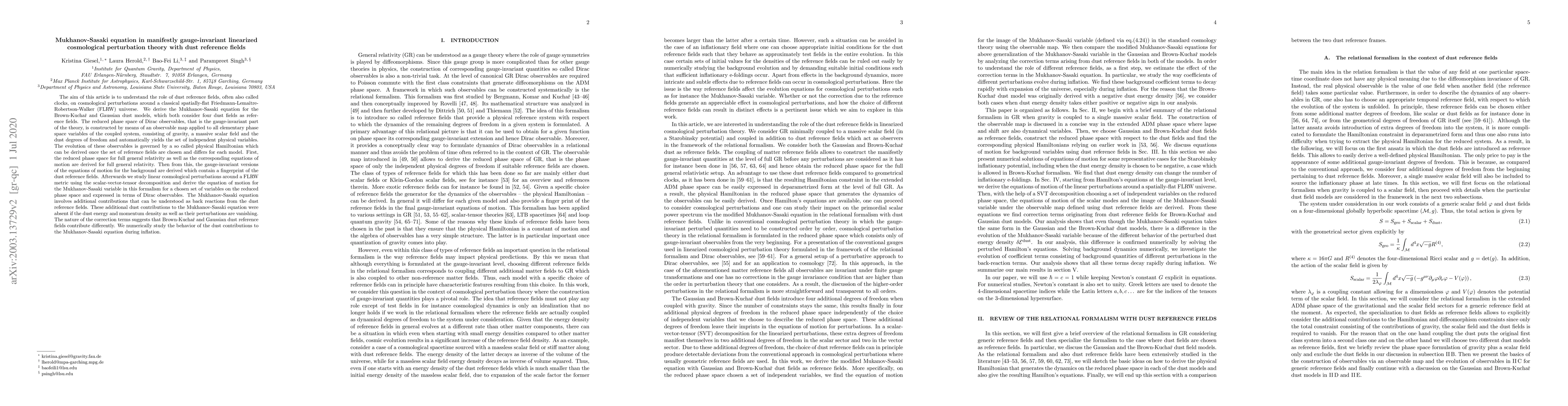 Researchers derived a modified Mukhanov-Sasaki equation that incorporates dust reference fields in cosmological perturbation theory, revealing additional corrections that vary between different dust models.