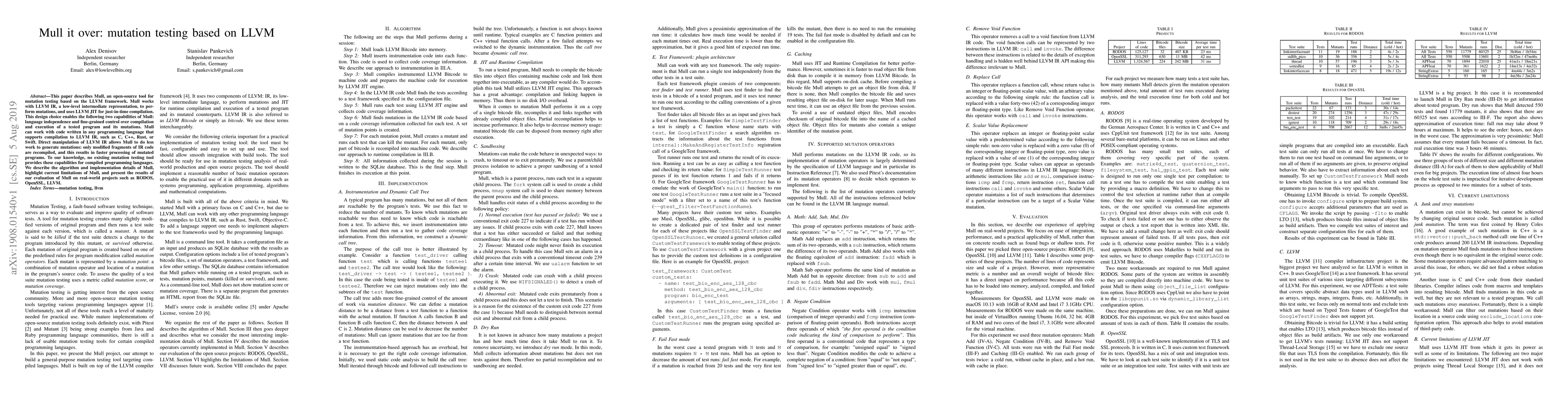 This paper describes Mull, an open-source tool for mutation testing based on the LLVM framework. Mull works with LLVM IR, a low-level intermediate representation, to perform mutations, and uses LLVM JIT for just-in-time compilation. This design choice enables the following two capabilities of Mull: language independence and fine-grained control over compilation and execution of a tested program and its mutations. Mull can work with code written in any programming language that supports compilation to LLVM IR, such as C, C++, Rust, or Swift. Direct manipulation of LLVM IR allows Mull to do less work to generate mutations: only modified fragments of IR code are recompiled, and this results in faster processing of mutated programs. To our knowledge, no existing mutation testing tool provides these capabilities for compiled programming languages. We describe the algorithm and implementation details of Mull, highlight current limitations of Mull, and present the results of our evaluation of Mull on real-world projects such as RODOS, OpenSSL, LLVM.