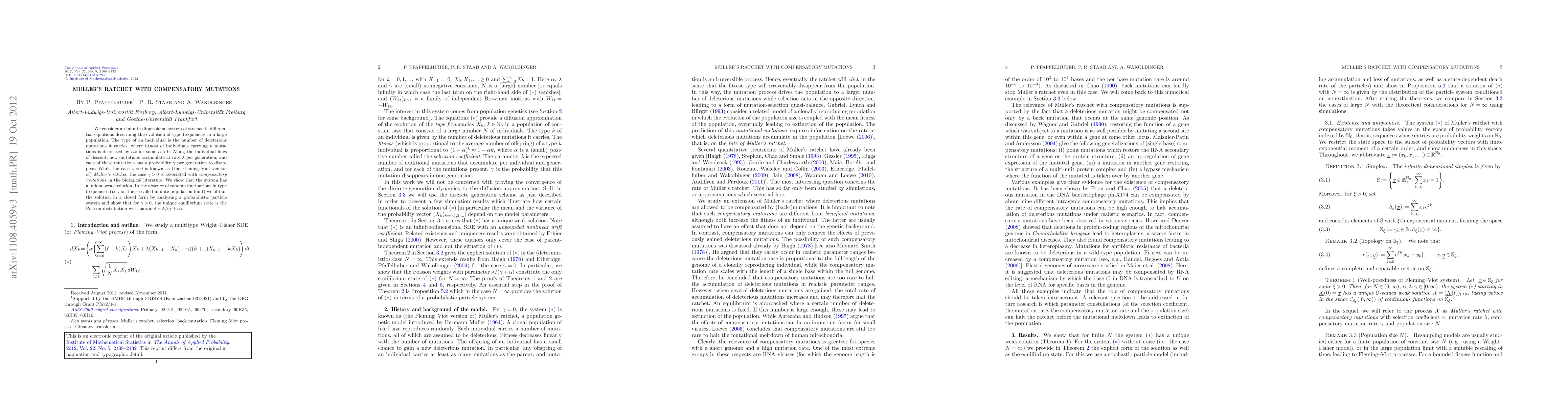 We consider an infinite-dimensional system of stochastic differential equations describing the evolution of type frequencies in a large population. The type of an individual is the number of deleterious mutations it carries, where fitness of individuals carrying k mutations is decreased by \alpha k for some \alpha>0. Along the individual lines of descent, new mutations accumulate at rate \lambda per generation, and each of these mutations has a probability \gamma per generation to disappear. While the case \gamma=0 is known as (the Fleming-Viot version of) Muller's ratchet, the case \gamma>0 is associated with compensatory mutations in the biological literature. We show that the system has a unique weak solution. In the absence of random fluctuations in type frequencies (i.e., for the so-called infinite population limit) we obtain the solution in a closed form by analyzing a probabilistic particle system and show that for \gamma>0, the unique equilibrium state is the Poisson distribution with parameter \lambda/(\gamma+\alpha).