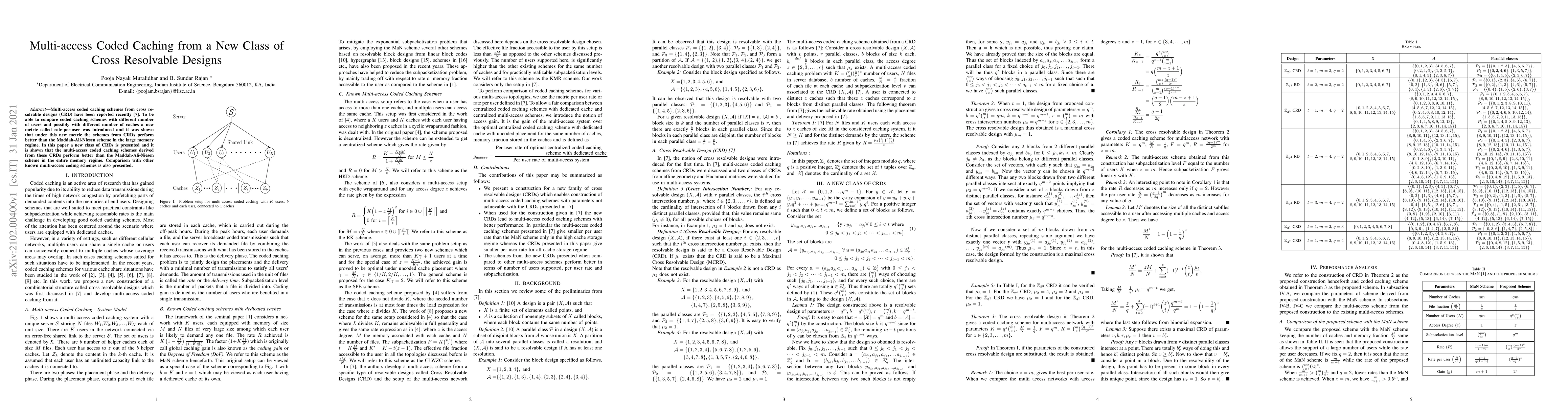 Multi-access coded caching schemes from cross resolvable designs (CRD) have been reported recently \cite{KNRarXiv}. To be able to compare coded caching schemes with different number of users and possibly with different number of caches a new metric called rate-per-user was introduced and it was shown that under this new metric the schemes from CRDs perform better than the Maddah-Ali-Niesen scheme in the large memory regime. In this paper a new class of CRDs is presented and it is shown that the multi-access coded caching schemes derived from these CRDs perform better than the Maddah-Ali-Niesen scheme in the entire memory regime. Comparison with other known multi-access coding schemes is also presented.