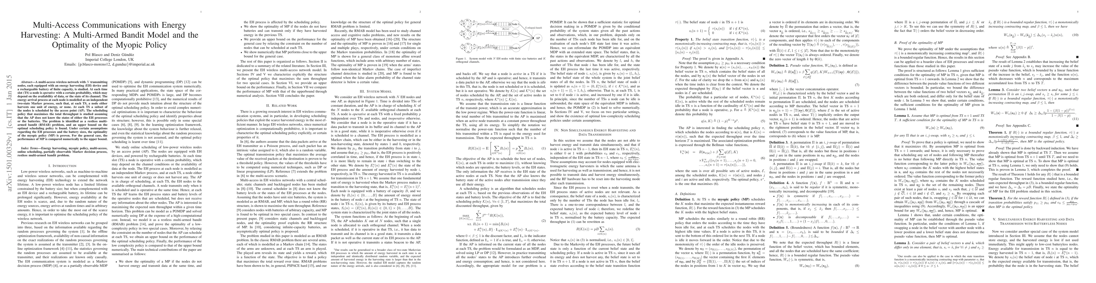 This paper studies a multi-access wireless network with energy harvesting nodes, modeling the problem as a restless multi-armed bandit. It proves the optimality of the myopic policy under specific conditions and compares its performance to an upper bound in general cases.