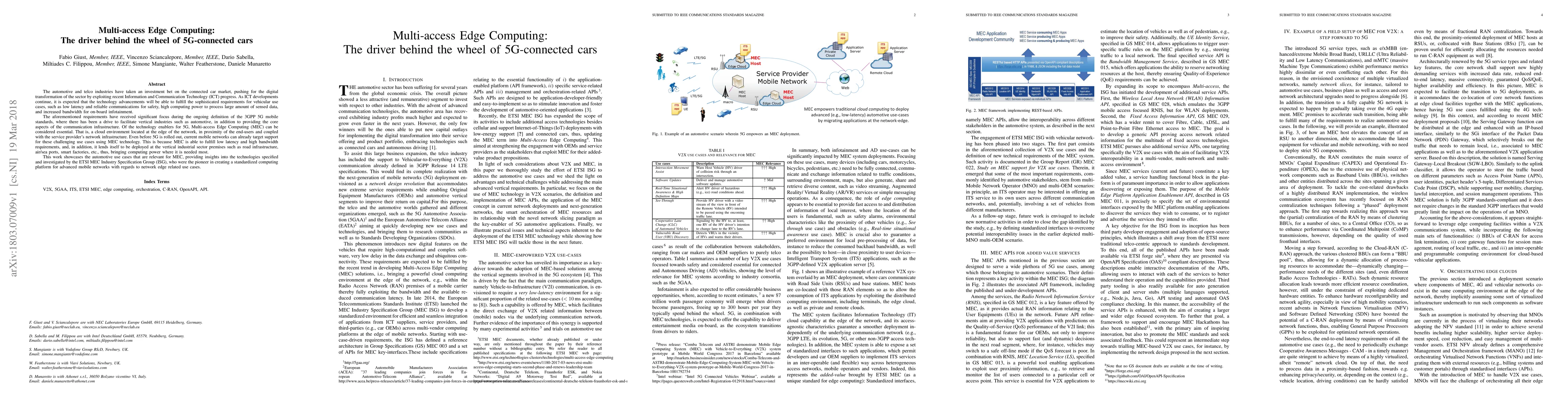 The automotive and telco industries have taken an investment bet on the connected car market, pushing for the digital transformation of the sector by exploiting recent Information and Communication Technology (ICT) progress. As ICT developments continue, it is expected that the technology advancements will be able to fulfill the sophisticated requirements for vehicular use cases, such as low latency and reliable communications for safety, high computing power to process large amount of sensed data, and increased bandwidth for on-board infotainment. The aforementioned requirements have received significant focus during the ongoing definition of the 3GPP 5G mobile standards, where there has been a drive to facilitate vertical industries such as automotive, in addition to providing the core aspects of the communication infrastructure. Of the technology enablers for 5G, Multi-access Edge Computing (MEC) can be considered essential. That is, a cloud environment located at the edge of the network, in proximity of the end-users and coupled with the service provider's network infrastructure. Even before 5G is rolled out, current mobile networks can already target support for these challenging use cases using MEC technology. This is because MEC is able to fulfill low latency and high bandwidth requirements, and, in addition, it lends itself to be deployed at the vertical industrial sector premises such as road infrastructure, air/sea ports, smart factories, etc., thus, bringing computing power where it is needed most. This work showcases the automotive use cases that are relevant for MEC, providing insights into the technologies specified and investigated by the ETSI MEC Industry Specification Group (ISG), who were the pioneer in creating a standardized computing platform for advanced mobile networks with regards to network edge related use cases.