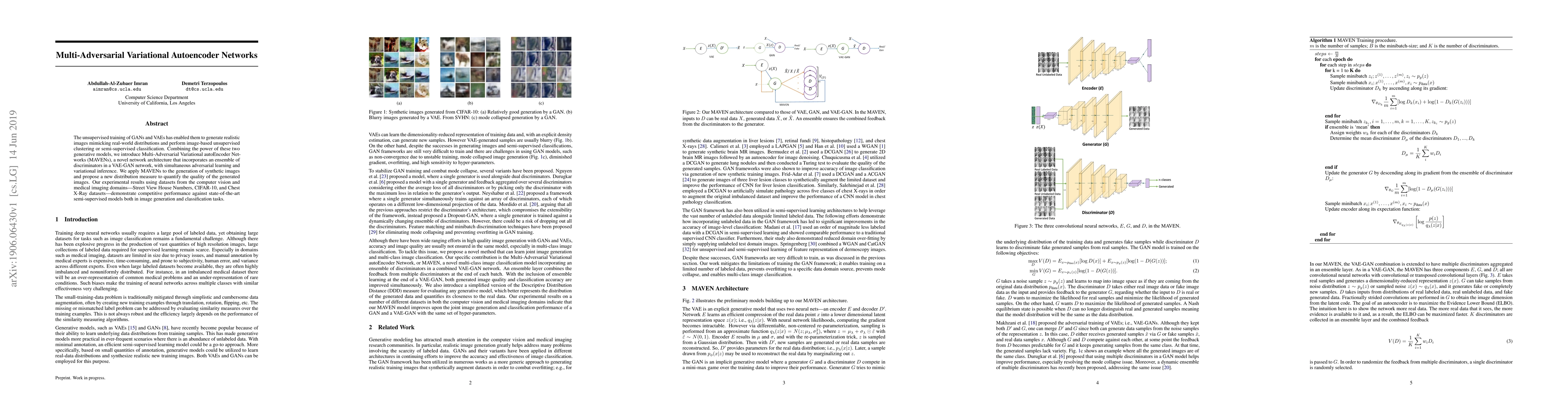 The paper introduces MAVENs, a novel network combining VAEs and GANs with multiple discriminators for adversarial learning and variational inference, achieving competitive performance in image generation and classification across various datasets. A new distribution measure is proposed to evaluate the quality of generated images.