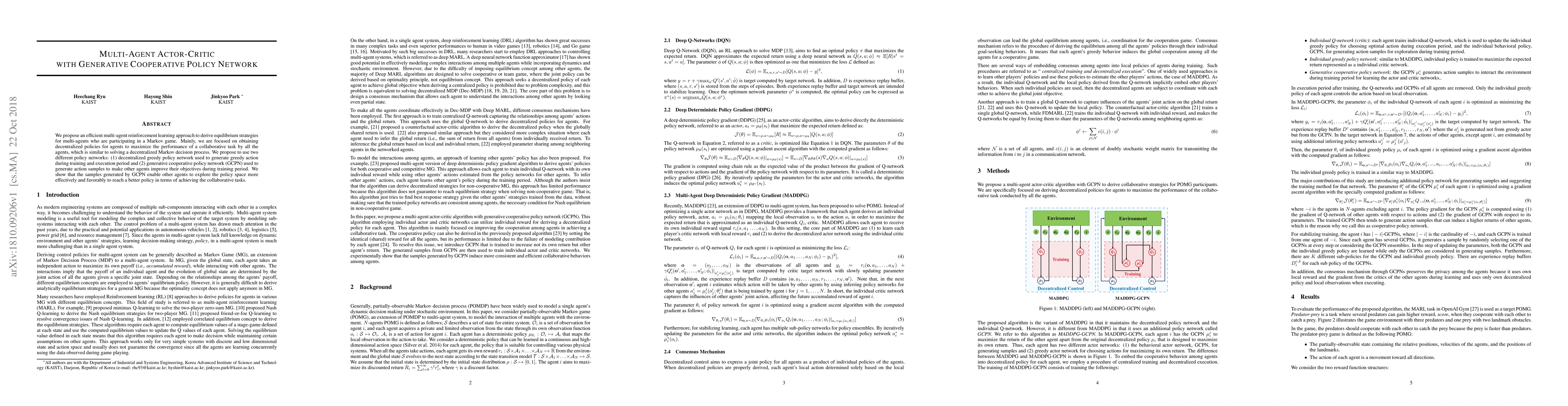 This paper proposes a multi-agent reinforcement learning method using an actor-critic framework with a generative cooperative policy network to derive equilibrium strategies for agents in a Markov game. The approach employs decentralized greedy and generative cooperative policy networks to enhance collaborative task performance and improve policy exploration.