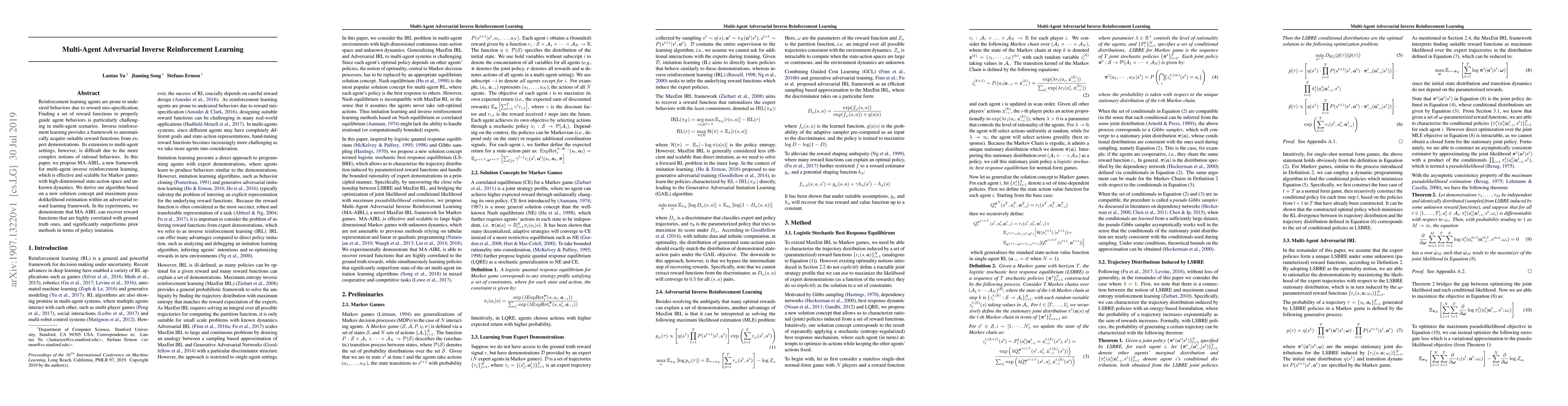 This paper introduces MA-AIRL, a scalable multi-agent adversarial inverse reinforcement learning framework for Markov games. It effectively recovers reward functions from expert demonstrations, outperforming prior methods in policy imitation.