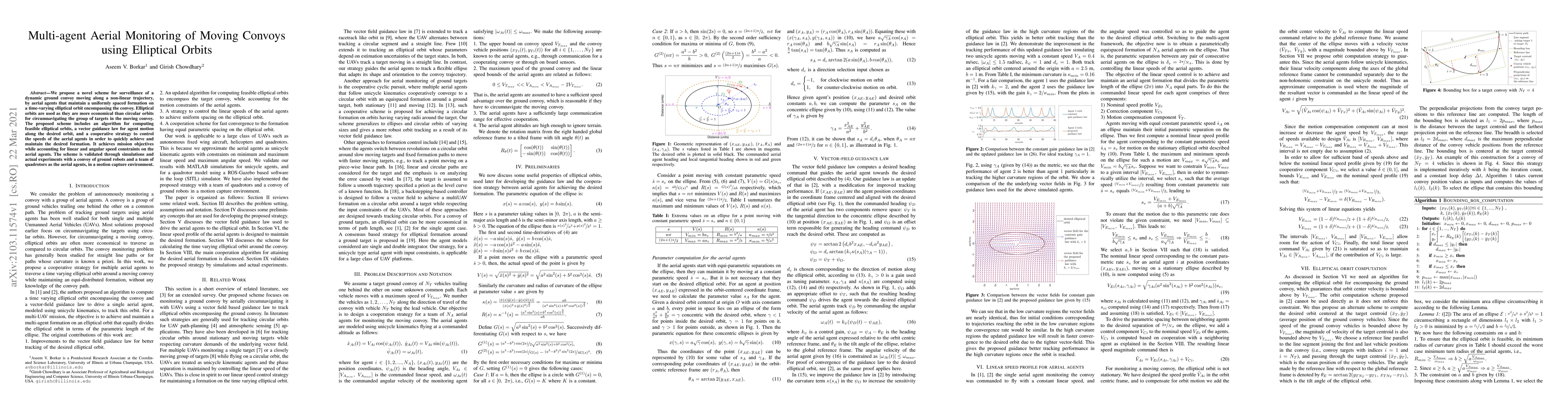 This research introduces a new method for aerial surveillance of moving ground convoys using elliptical orbits, which are more energy-efficient than circular ones. The approach involves algorithms for computing orbits, guiding agents, and controlling their speeds, all while respecting constraints. It's been validated through simulations and real-world experiments with robots and quadrotors.