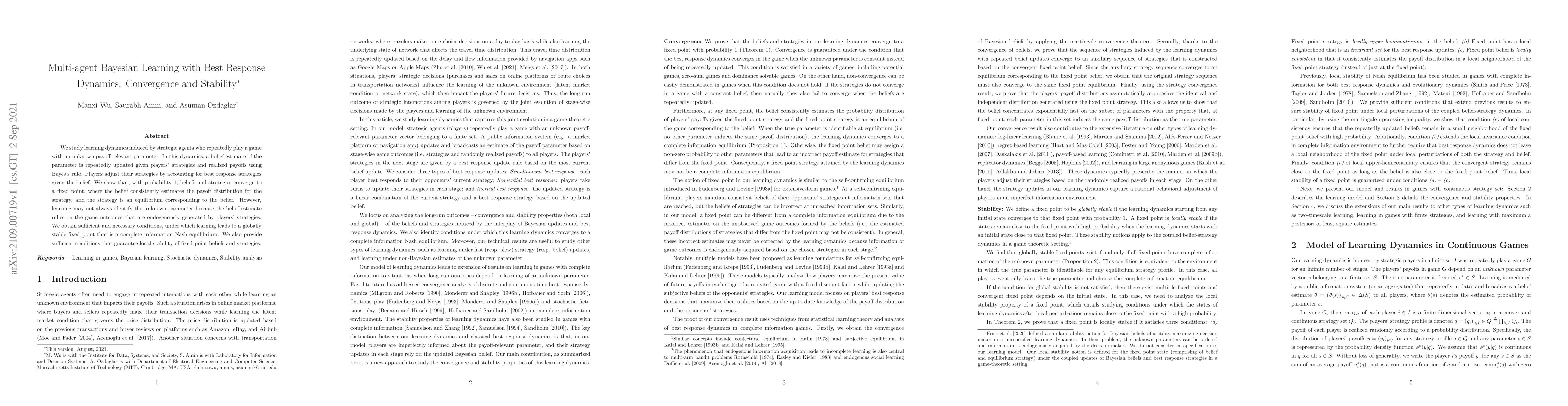 We study learning dynamics induced by strategic agents who repeatedly play a game with an unknown payoff-relevant parameter. In this dynamics, a belief estimate of the parameter is repeatedly updated given players' strategies and realized payoffs using Bayes's rule. Players adjust their strategies by accounting for best response strategies given the belief. We show that, with probability 1, beliefs and strategies converge to a fixed point, where the belief consistently estimates the payoff distribution for the strategy, and the strategy is an equilibrium corresponding to the belief. However, learning may not always identify the unknown parameter because the belief estimate relies on the game outcomes that are endogenously generated by players' strategies. We obtain sufficient and necessary conditions, under which learning leads to a globally stable fixed point that is a complete information Nash equilibrium. We also provide sufficient conditions that guarantee local stability of fixed point beliefs and strategies.