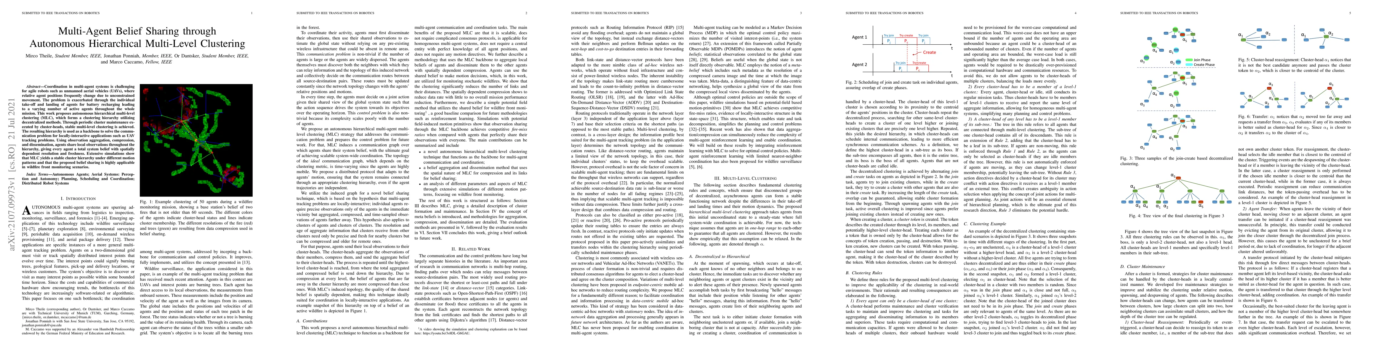 This paper proposes autonomous hierarchical multi-level clustering (MLC) to facilitate coordination in multi-agent systems, particularly UAVs, by forming a stable clustering hierarchy for communication. MLC enables agents to share local observations, providing a total system belief, and is shown to be effective in wildfire front monitoring simulations.